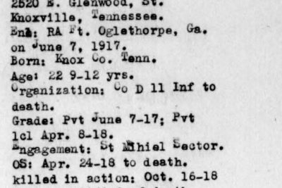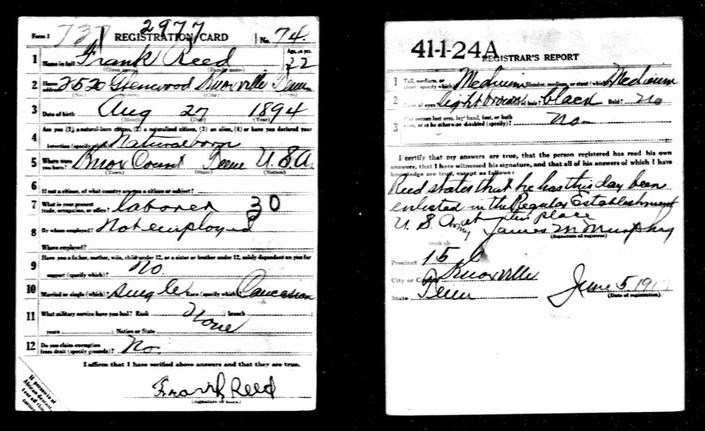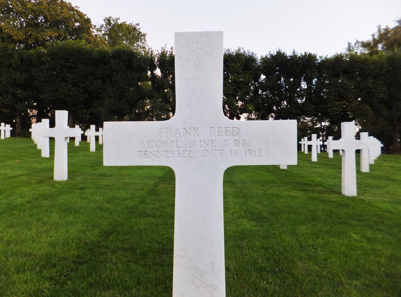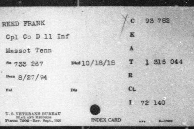 Frank Reed enlisted in the regular army at Knoxville on June 5, 1917, and was assigned to Company D, 11th Infantry, 5th Division. He trained with his organization at Fort Oglethorpe, GA, and went overseas in May 1918. Corporal Reed was killed September 14, 1918, in the great American attack on the St. Mihiel salient.