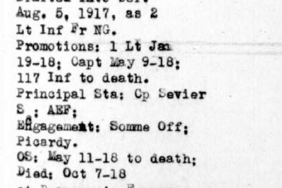He entered the service June 26, 1916, as a member of the Third Tennessee, from which he was transferred to the Supply Company, 117th Infantry at Camp Sevier, SC. Later assigned to the command of Company I, 117th Infantry. Embarked for France on May 11, 1918. Was engaged with his company in the battles of Ypres, Hindenburg Line, Bellicourt, Nauroy, and Busigny, where he was severely wounded on October 7, 1918. Died on October 9 in a German hospital. He is buried in plot A, row 25, grave 13, Somme American Cemetery, Bony, France.