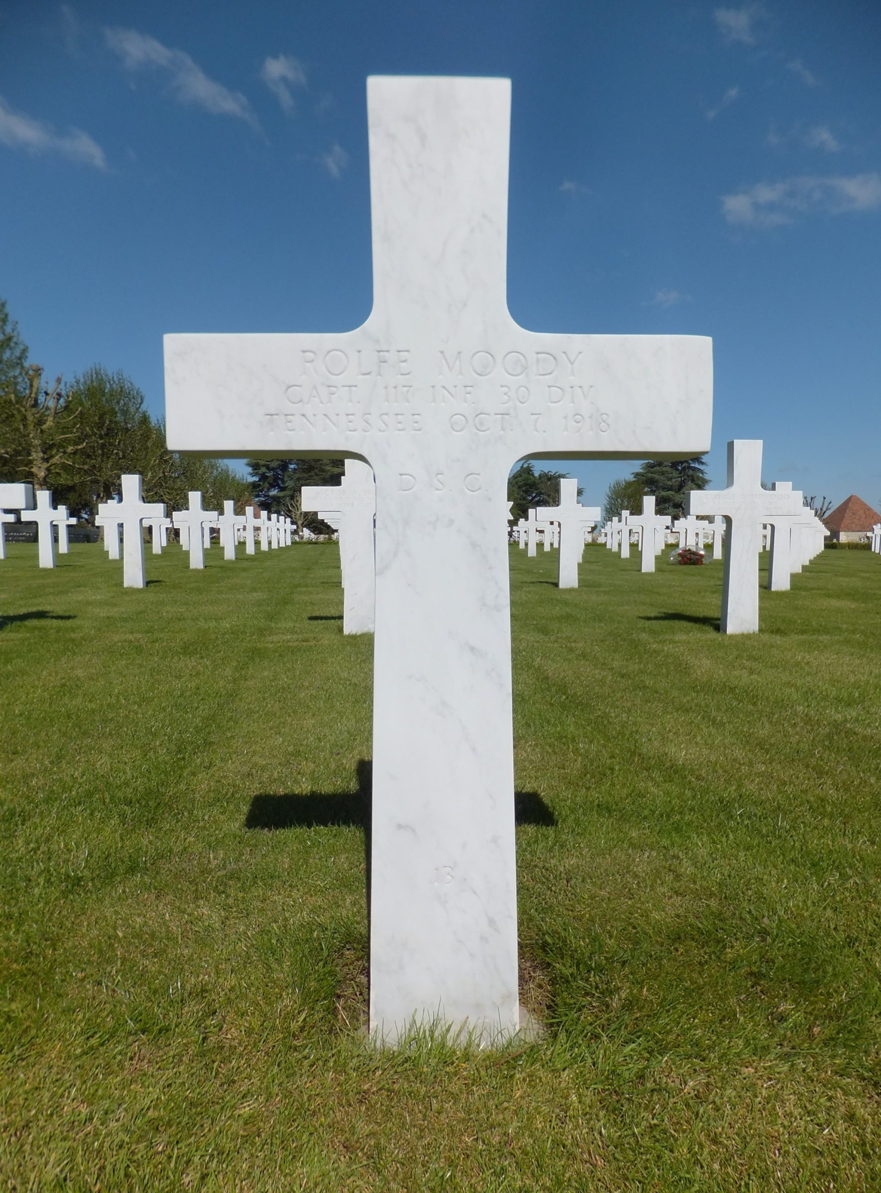 The President of the United States of America, authorized by Act of Congress, July 9, 1918, takes pride in presenting the Distinguished Service Cross Posthumously to Captain Infantry Rolf Moody, United States Army, for extraordinary heroism in action while serving with 117th Infantry Regiment, 30th Division, A.E.F., near Beaurevoir, France, 7 October 1918. Captain Moody was in command of his company on the left flank of the assaulting battalion, when withering machine-gun fire from an old factory building held up the advance of the entire left flank. Realizing the gravity of the situation, he took two squads and led them in an attack on the machine-gun positions over ground swept by machine-gun and shell fire. After a personal encounter in which he used his pistol and hand grenades, the machine guns were silenced. From there he started toward another machine-gun post, but was mortally wounded before reaching it, dying on the field. War Department, General Orders 87 1919.