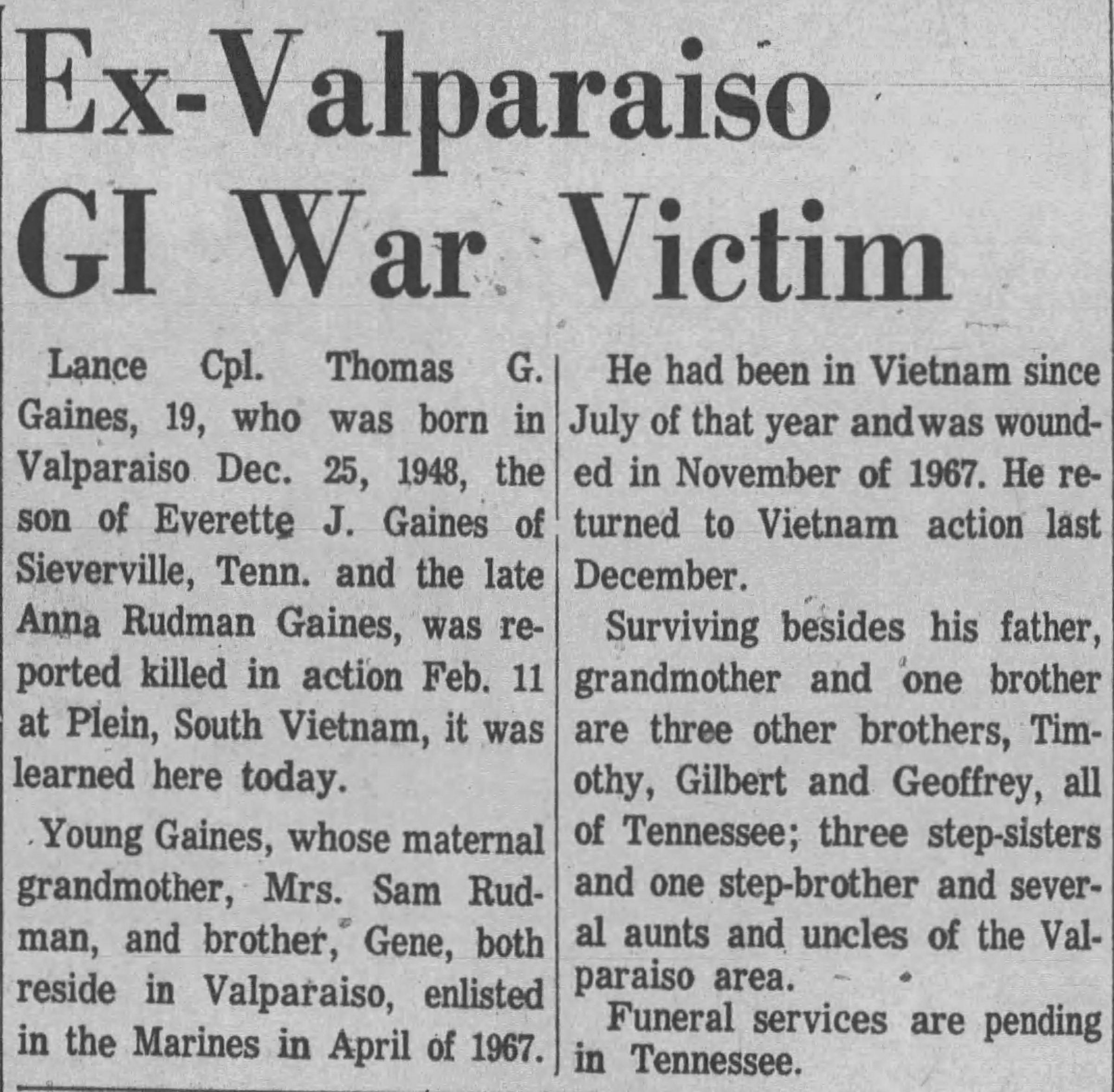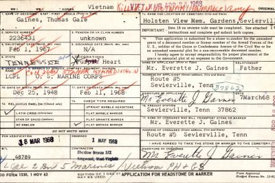 Lance Corporal Thomas Gale Gaines was born on December 25, 1948, and was originally from Ludowici, Georgia. He served his country in the Vietnam War in the United States Marine Corps, as a rifleman in H Company, 2nd Battalion, 5th Marines, 1st Marine Division. His tour in Vietnam began on July 28, 1967. On February 11, 1968, LCpl. Gaines was killed under hostile conditions from an explosive device in Thua Thien province, South Vietnam; he was 19 years old at the time of his death. LCpl. Gaines is memorialized on the Vietnam Veterans Memorial on Panel 38E, Line 76.
