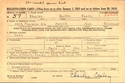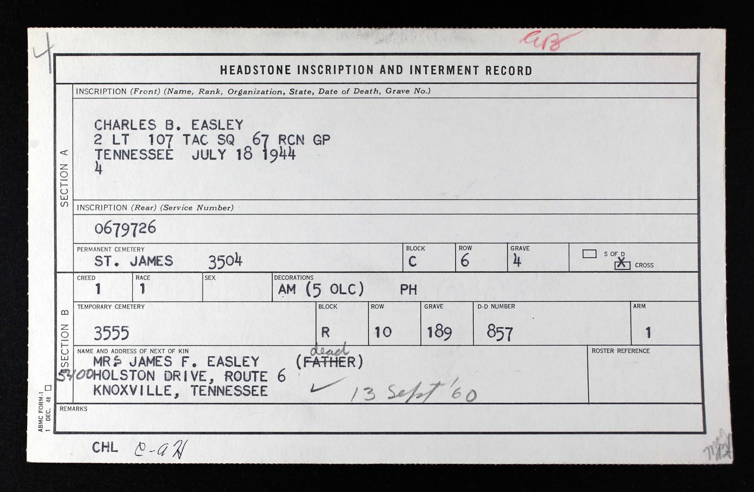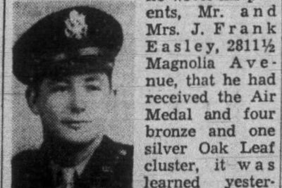 Second Lt. Charles B. Easley, 23, was reported missing in action in France July 18, the same day he wrote his parents, Mr. and Mrs. J. Frank Easley, 2811 ½ Magnolia Avenue, that he had received the Air Medal and four bronze and one silver Oak Leaf cluster, it was learned yesterday. Lieutenant Easley, a P-51 Mustang Fighter pilot, has participated in 31 flying missions. He enteres the service in August, 1942, and has been overseas since March of this year.