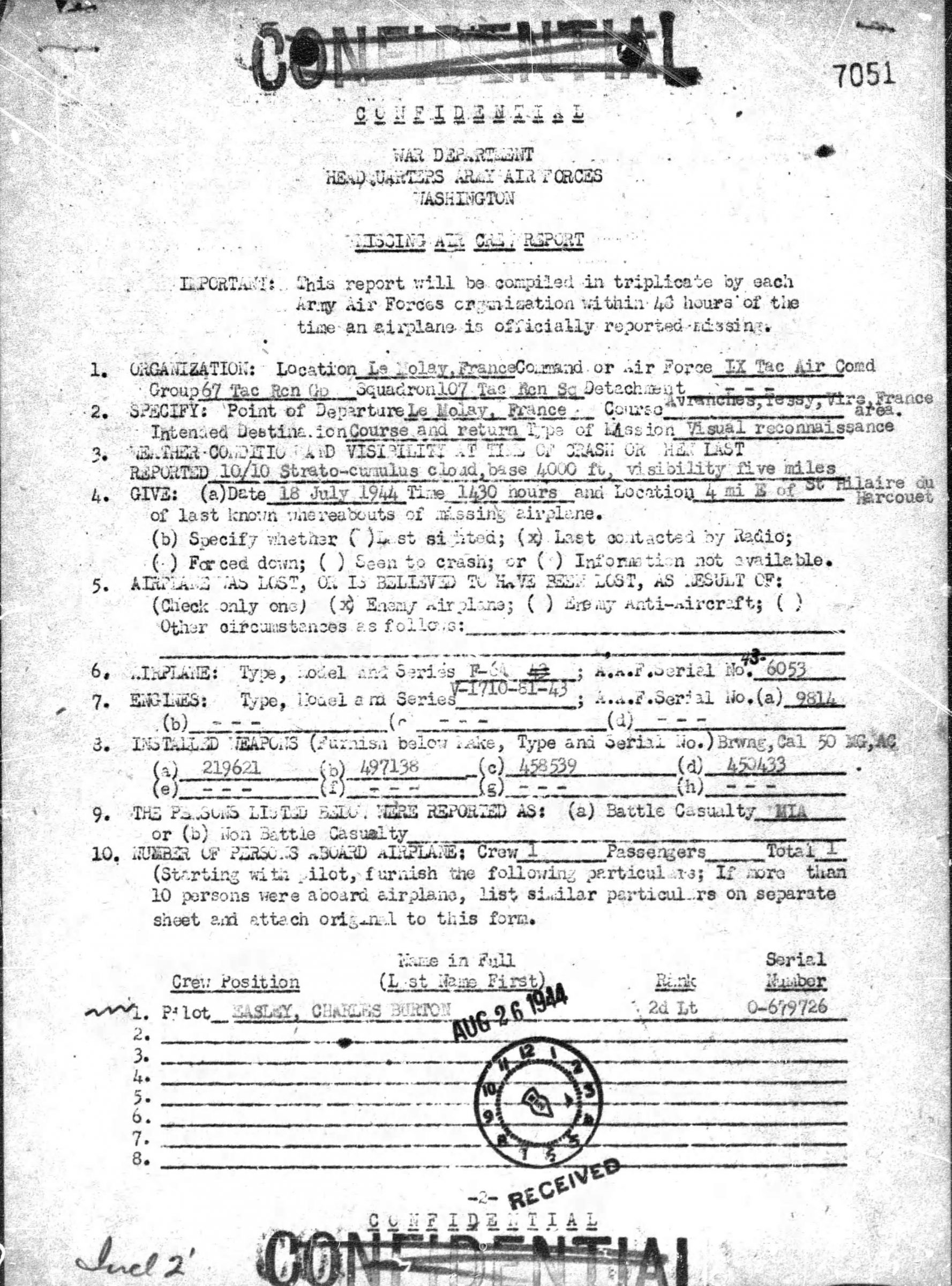 On 18 July 1944, I flew a visual reconnaissance mission with 2nd Lt Charles B. Easley, south and east of Avranches, France. At approximately 1415 hours, I saw four aircraft drop below the overcast headed in our direction. I reported the bogies as being at nine o’clock and Lt Easley acknowledged receipt of my message. A few seconds later some eight other sections followed the original four which were now recognized as ME 109s. I called a break to the left which we both executed and then I headed for the deck giving similar instructions to Lt Easley. While on the deck he called and asked if I was still with him. After informing him that I was and to continue on home, a section of two aircraft dove at me from three o’clock. When the lead ship started firing I broke right, into them and after they had passed, turned North and headed for home. A few seconds later I saw tracers off my left wing and broke in that direction. The enemy aircraft broke off the attack and while in this turn, looking south, I saw a cloud of smoke and dust which I assume to be an aircraft; probably Lt Easley. Last contact was made by radio prior to the second break.