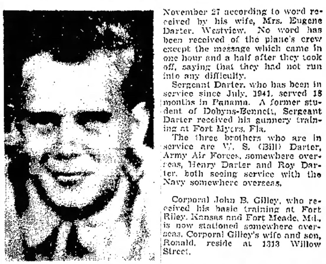 Staff Sergeant Eugene Darter, tail gunner on a Flying Fortress B-17 has been missing since his plane disappeared over the Atlantic on November 27 according to word received by his wife, Mrs. Eugene Darter, the former Miss Ruth Pierson, Westview. No word has been received of the plane’s crew except the message which came in one hour and a half after they took off, saying that they had not run into any difficulty. Staff Sergeant Darter, who has been in service since July, 1941, served 18 months in Panama. A former student of Dohyns-Bennett, Sergeant Darter received his gunnery training at Fort Myers, Fla. The three brothers who are in service are W.S. (Bill) Darter, Army Air Force, somewhere overseas, Henry Darter and Roy Darter, both seeing service with the Navy somewhere overseas.