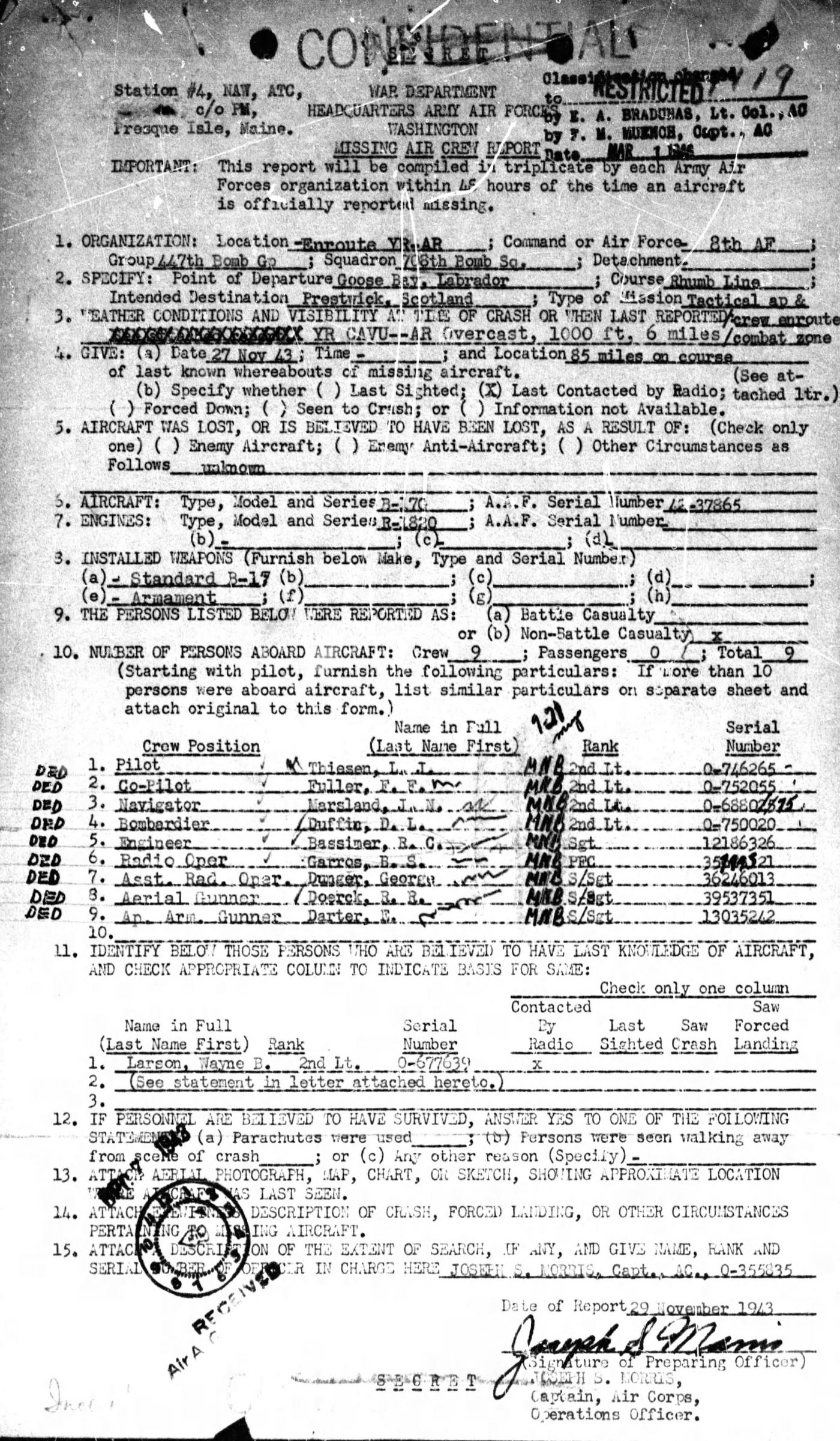 Aircraft B-17G with serial number 42-37865 departed from Goose Bay, Labrador at 0233 GMT, 27 November 1943 for Prestwick, Scotland and has been unaccounted for since RADAR equipment at Goose Bay lost track of it 85 miles out and on course. Weather conditions enroute and at the terminal were considered satisfactory for the trip and were proved so by the successful completion of flights by two other similarly routed B-17’s which departed the same night.