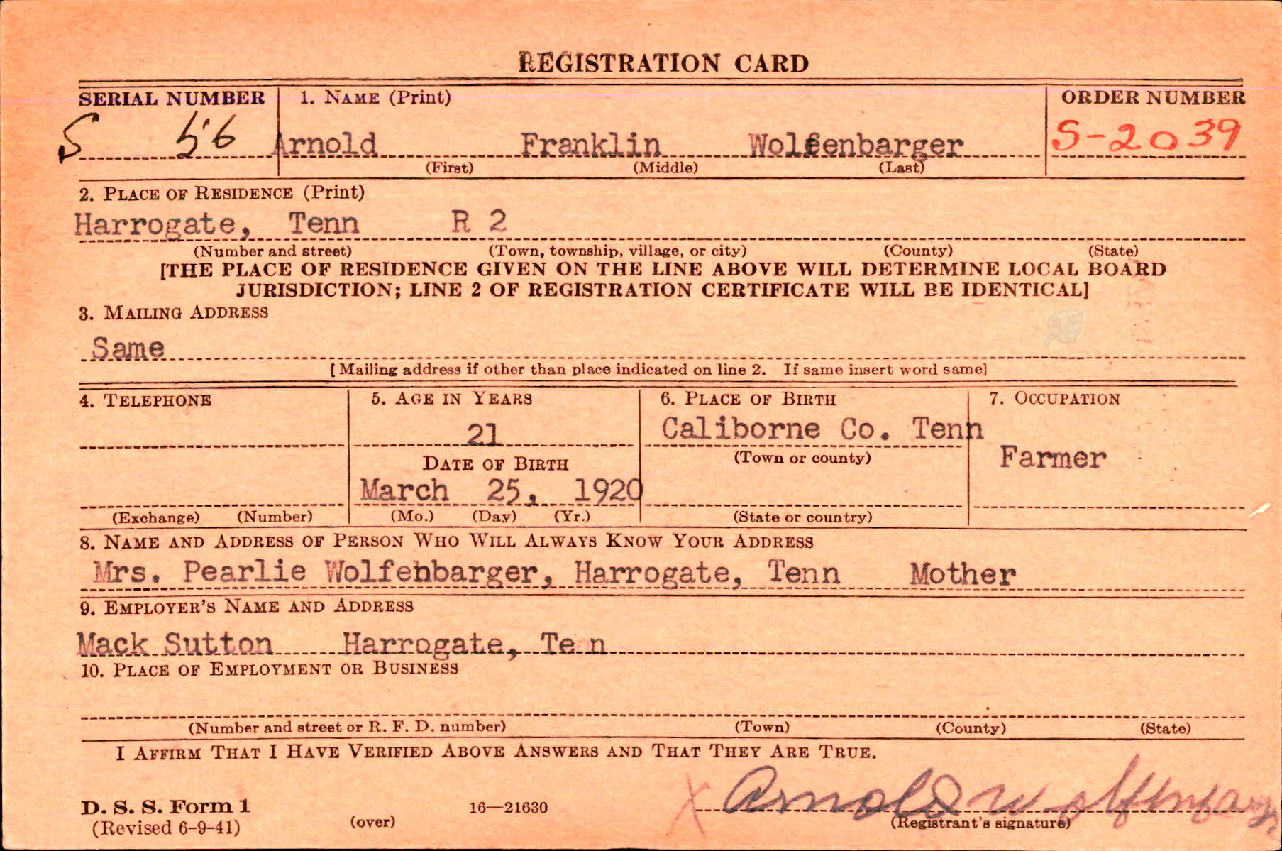 Staff Sergeant Arnold F. Wolfenbarger of Harrogate, was born March 25, 1920 and was inducted in the army January 16, 1942. He served in the U.S. two years and was sent overseas January 1944. He was wounded in France, June 21, three months later he joined his Company and was killed in action November 22, somewhere in Germany.