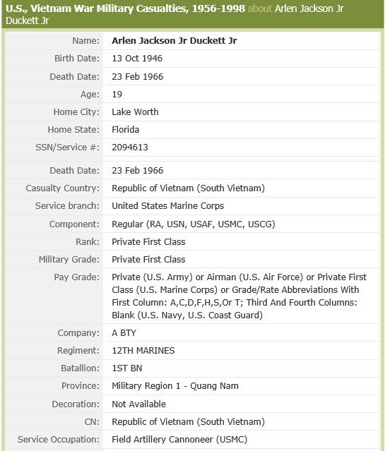 Arlen Jackson Duckett Jr. was killed in a non-hostile action. He was serving with A Battery, 1st Battalion, 12th Marines, 3rd Marine Division, in Quang Nam Province, South Vietnam