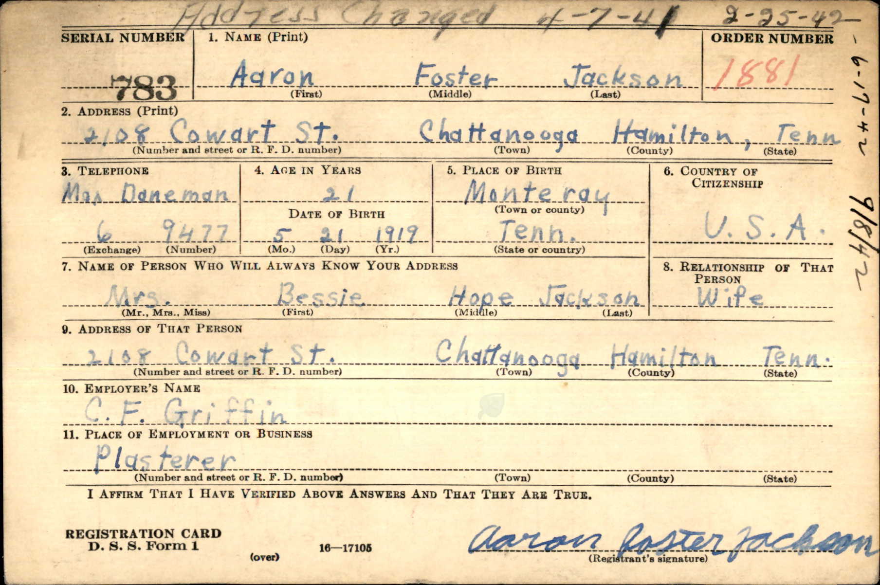 Wife: Mrs. Aaron F. Jackson, 2110 Cowart Street, Chattanooga