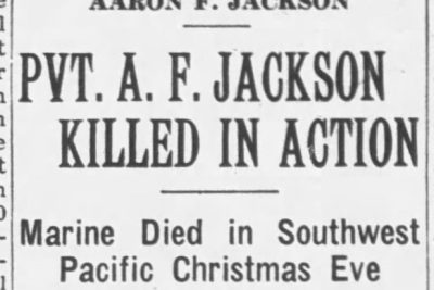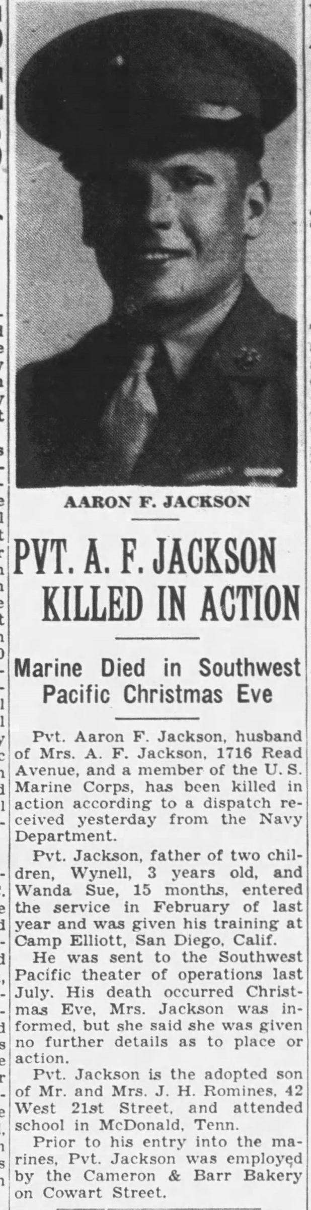 Pvt. Aaron F. Jackson, husband of Mrs. A.F. Jackson, 1716 Read Avenue and a member of the U.S. Marine Corps, has been killed in action according to a dispatch received yesterday from the Navy Department. Pvt. Jackson, father of two two children, Wynell, 3 years old, and Wanda Sue, 15 months, entered the service in February of last year and was given his training at Camp Elliott, San Diego, Calif.