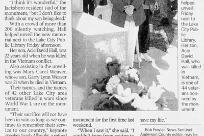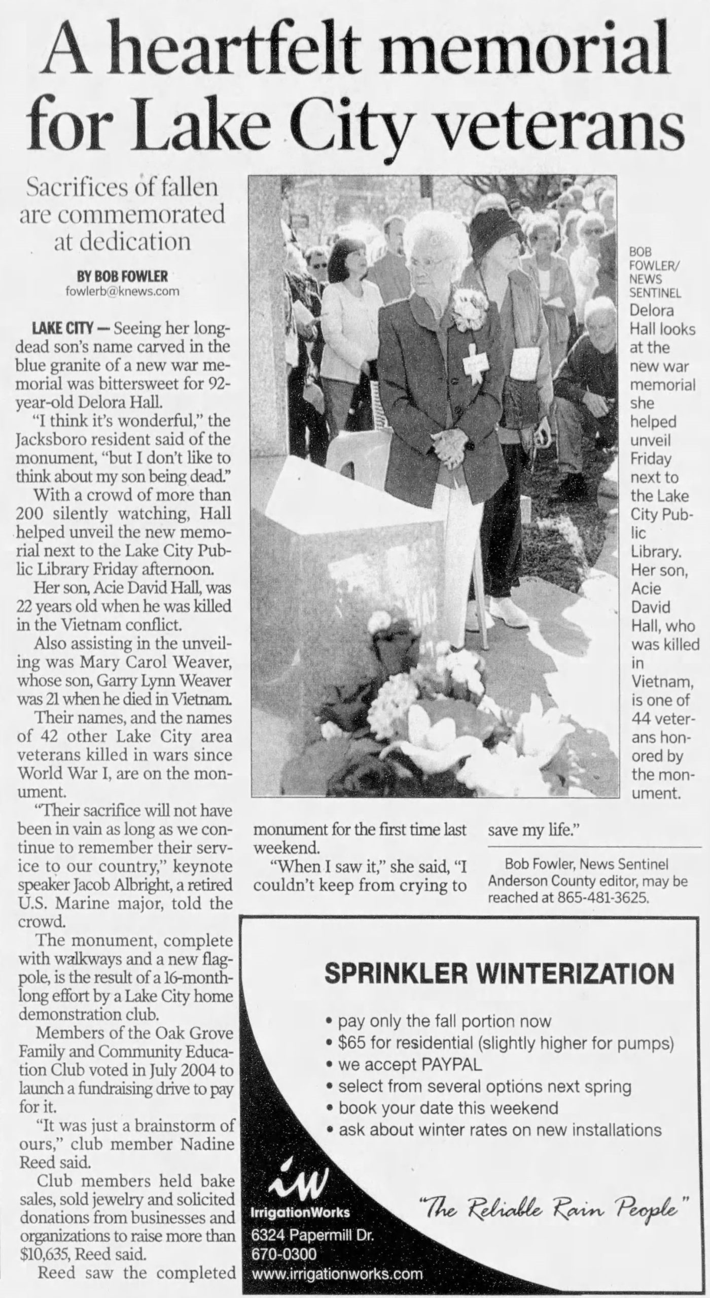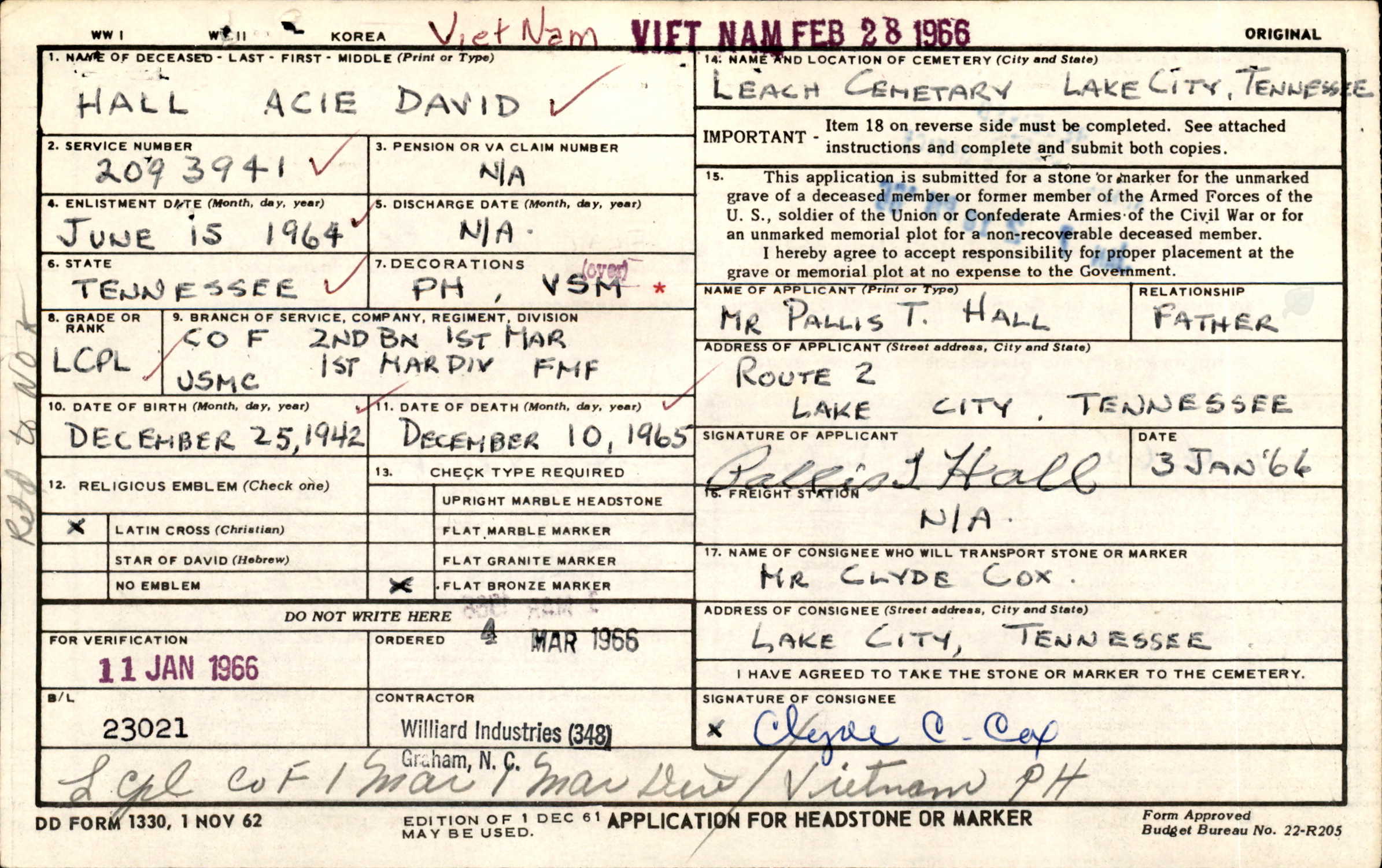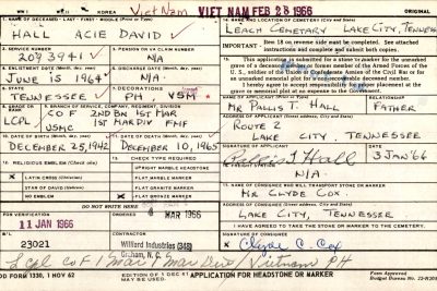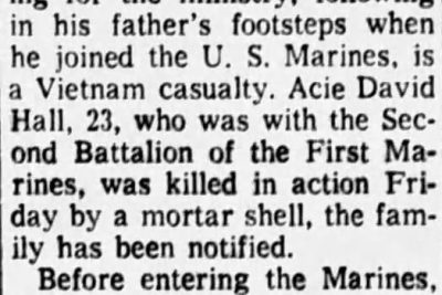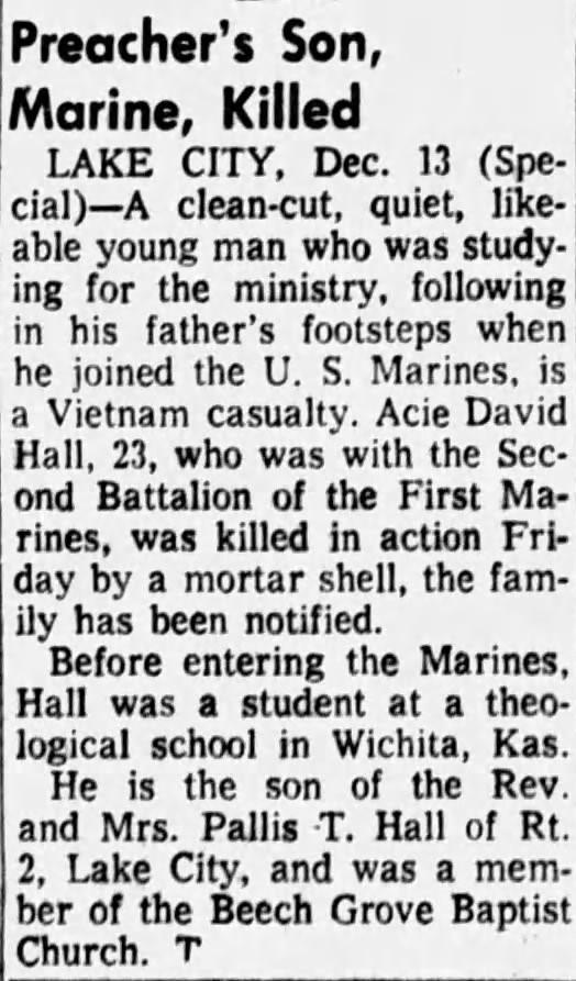 A clean-cut, quiet, like-able young man who was studying for the ministry, following in his father’s footsteps when he joined the U.S. Marines, is a Vietnam casualty. Acie David Hall, 23, who was with the Second Battalion of the First Marines, was killed in action Friday by a mortal shell, the family has been notified. Before entering the Marines, Hall was a student at a theological school in Wichita, Kansas. He is the son of the Rev. and Mrs. Pallis T. Hall of Rt. 2, Lake City, and was a member of the Beech Grove Baptist Church.