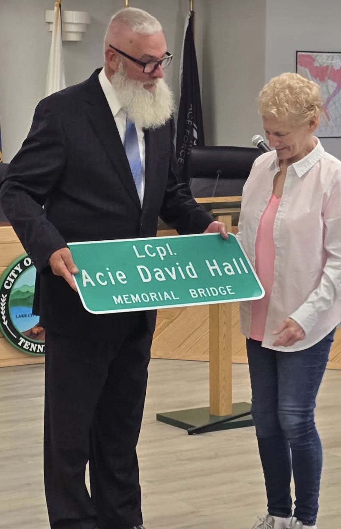 On July 18, 2025 interstate bridge on N I-75 exit 128 in Anderson County (Rocky Top/Lake City) was dedicated to Acie D. Hall for his service and sacrifice. Pictured below are Rocky Top Mayor Kerry Templin and Hall’s former sister-in-law Darlene Wilson. Source from The Clinton Courier, Clinton TN.