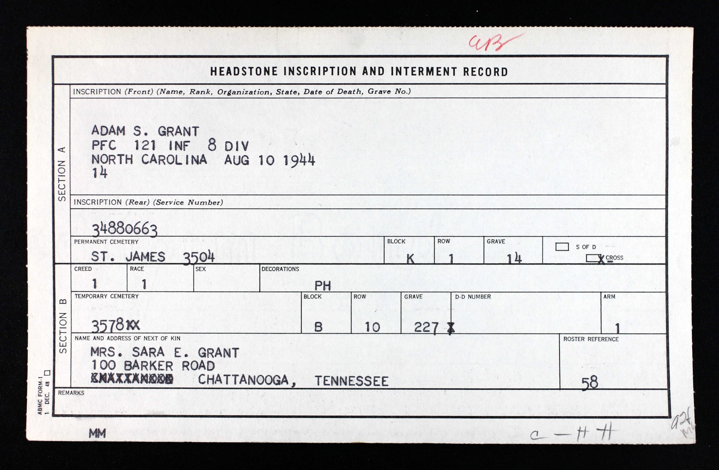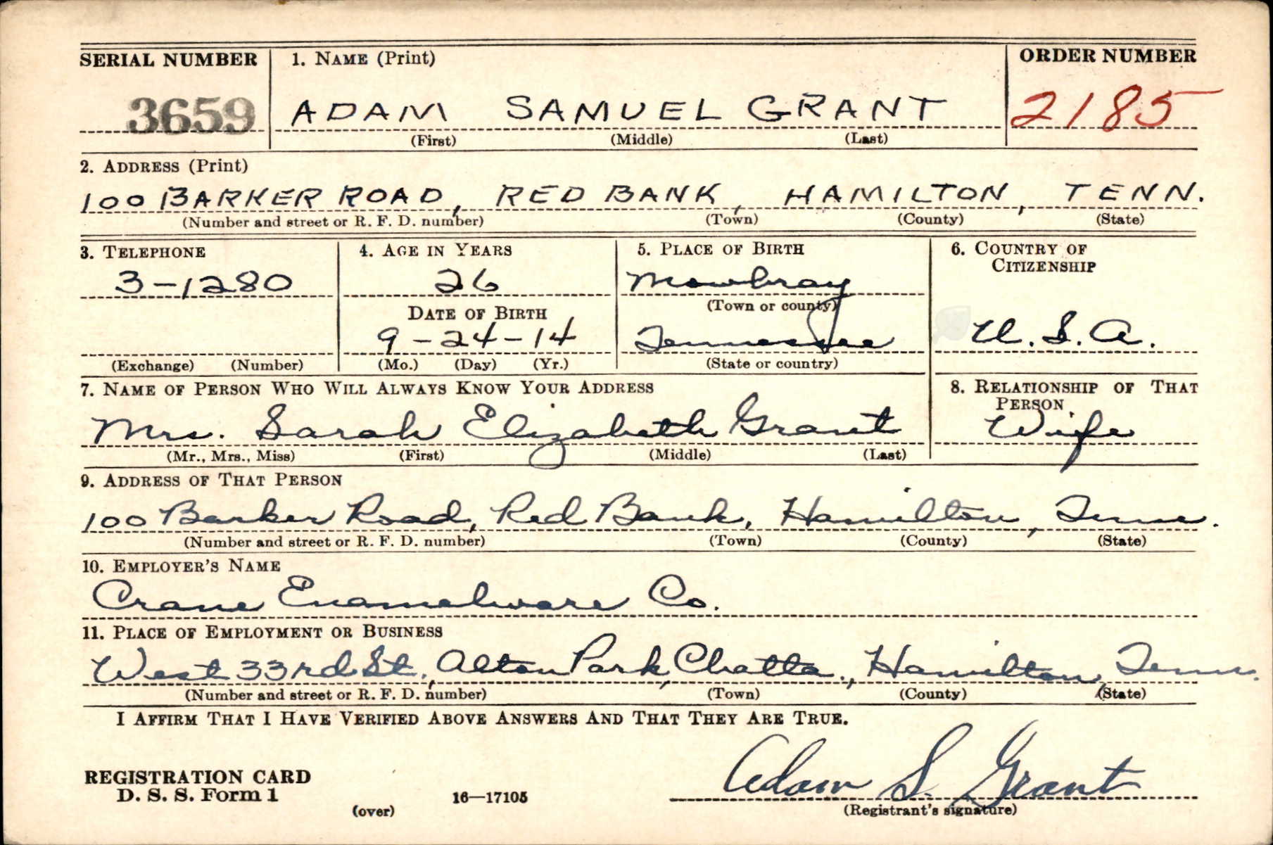Adam Samuel Grant was born on 24 September 1914 at Mowbray Mtn., Hamilton, Tennessee, the son of Alberto (Berto) Richard Grant and Susan (Susie) Eleanor Yother. Husband of Elizabeth Sarah Coleman.