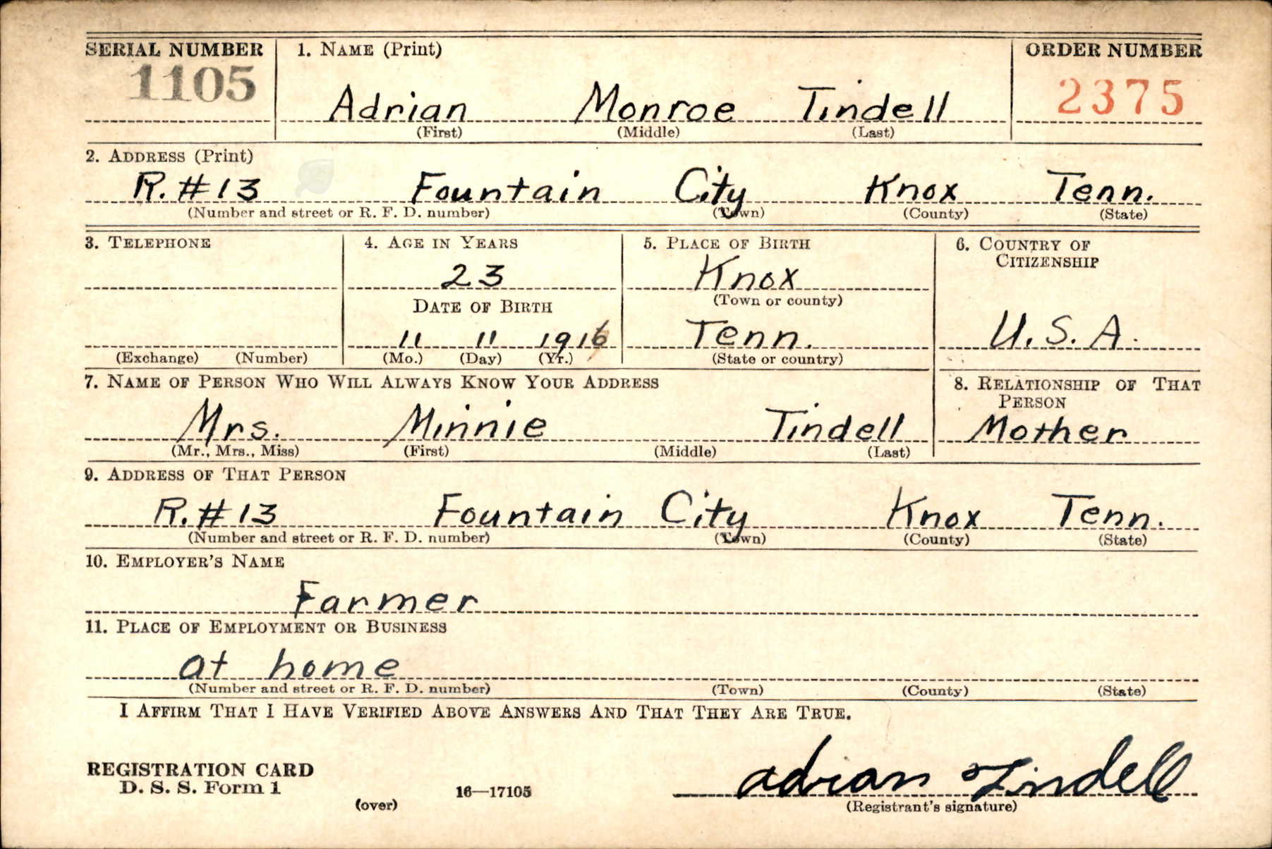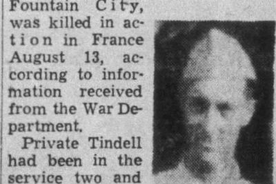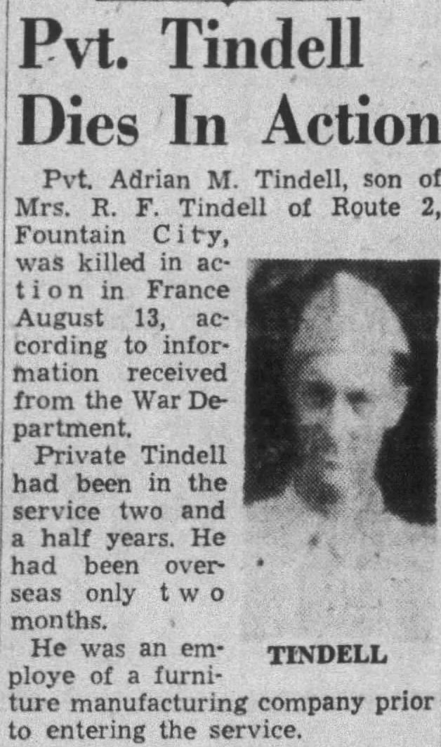 Pvt. Adrian M. Tindell, son of Mrs. R.F. Tindell of Route 2, Fountain City, was killed in action in France, August 13, according to information received from the War Department. Private Tindell had been in the service two and a half years. He had been overseas only two months. He was an employe of a Furniture manufacturing company prior to entering the service.