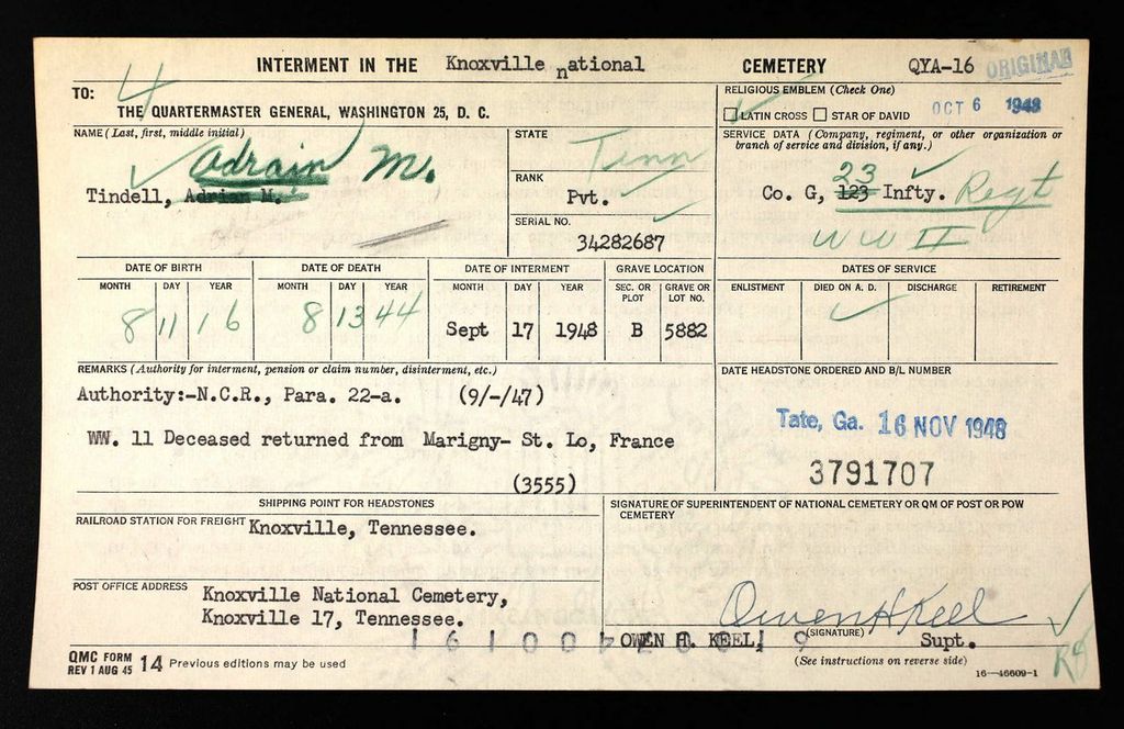 Pvt Tindell was returned from Marigny-/St-Lo, France. He served with the 23rd Infantry Regiment, Company G.