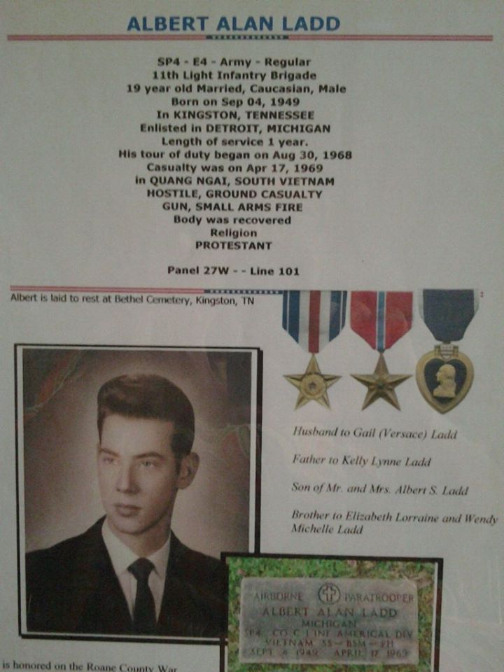 Specialist 4 Albert Alan Ladd was born on September 4, 1949, and was originally from Roane County, Tennessee. He was the son of Albert S. Ladd (b. 1927) and Virginia Ladd (1932-2004). He served his country in the Vietnam War in the United States Army, as a paratrooper in C Company, 3rd Battalion, 1st Infantry, 11th Infantry Brigade, Americal Division. His tour in Vietnam began on August 30, 1968. On April 17, 1969, SP4 Ladd was killed under hostile conditions in Quang Ngai province, South Vietnam; he was 19 at the time of his death. He was the recipient of the Bronze Star and Purple Heart medals. SP4 Ladd is buried at Bethel Cemetery in Kingston, Tennessee, and is memorialized on the Vietnam Veterans Memorial on Panel 27W, Line 101.