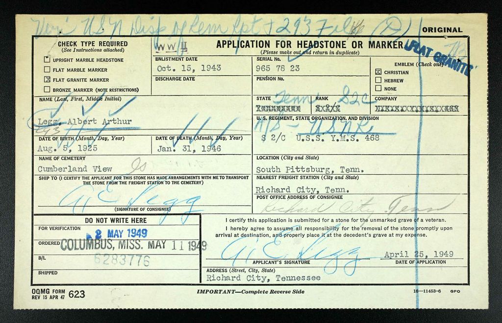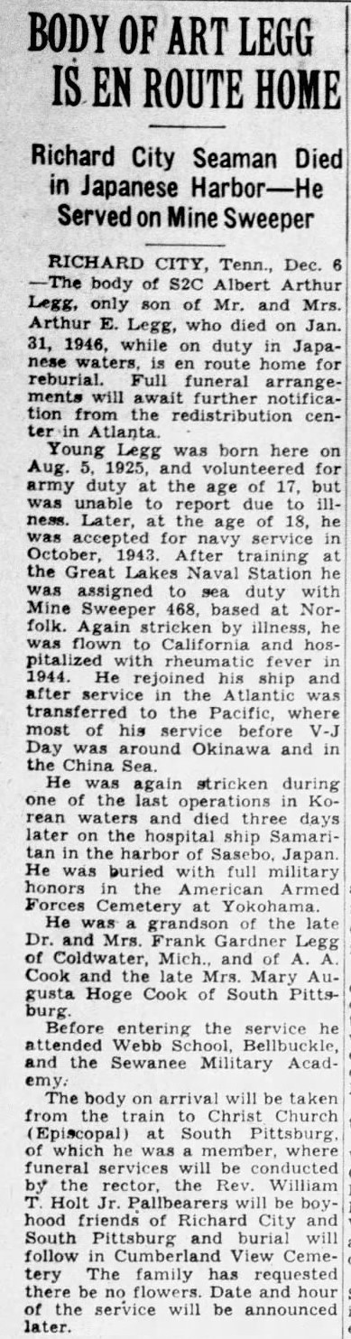 The body of S2C Albert Arthur Legg, only son of Mr. and Mrs. Arthur E. Legg, who died on Jan. 31, 1946, wile on duty in Japanese waters, is en route home for reburial. Full funeral arrangements will await further notification from the redistribution center in Atlanta. Young Legg was born here on Aug. 5, 1925, and volunteered for army duty at the age of 17, but was unable to report due to illness. Later, at the age of 18, he was accepted for navy service in October, 1943. After training at the Great Lakes Naval Station he was assigned to sea duty with Mine Sweeper 468, based at Norfolk. Again stricken by illness, he was flown to California and hospitalized with rheumatic fever in 1944. He rejoined his ship and after service in the Atlantic was transferred to the Pacific, where most of his service before V-J Day was around Okinawa and in the China Sea. He was again stricken during one of the last operations in Korean waters and died three days later on the hospital ship Samaritan in the harbor of Sasebo, Japan. He was buried with full military honors in the American Armed Forces Cemetery at Yokohama. He was a grandson of the late Dr. and Mrs. Frank Gardner Legg of Coldwater, Mich., and of A.A. Cook and the late Mrs. Mary Augusta Hoge Cook of South Pittsburgh. Before entering the service he attended Webb School, Bellbuckle, and the Sewanee Military Academy.