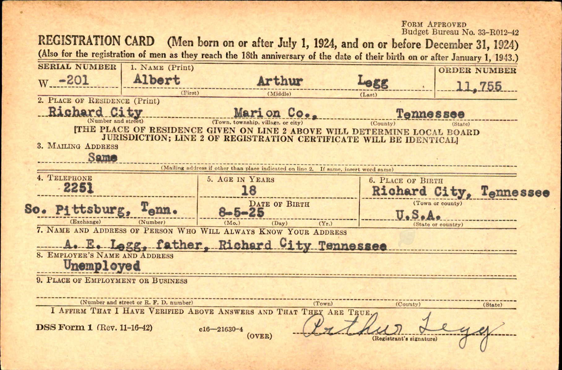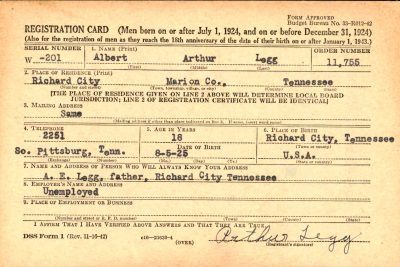Albert Arthur “Art” Legg was born on 5 August 1925, the son of Arthur Edward Legg and Mary Virginia “Mamie” Cook.