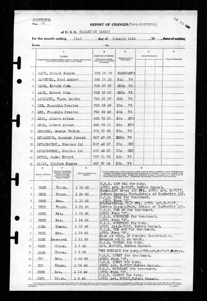 Served on the U.S.S. Samaritan (AH10). On 30 January 1946 he was transferred to the Y.M.S. 468 for treatment where he died at 0910, of Purpura Hemorrhagica