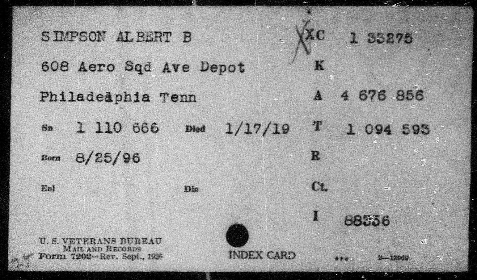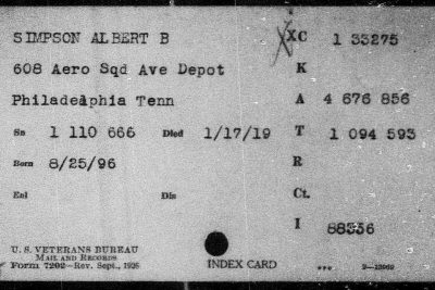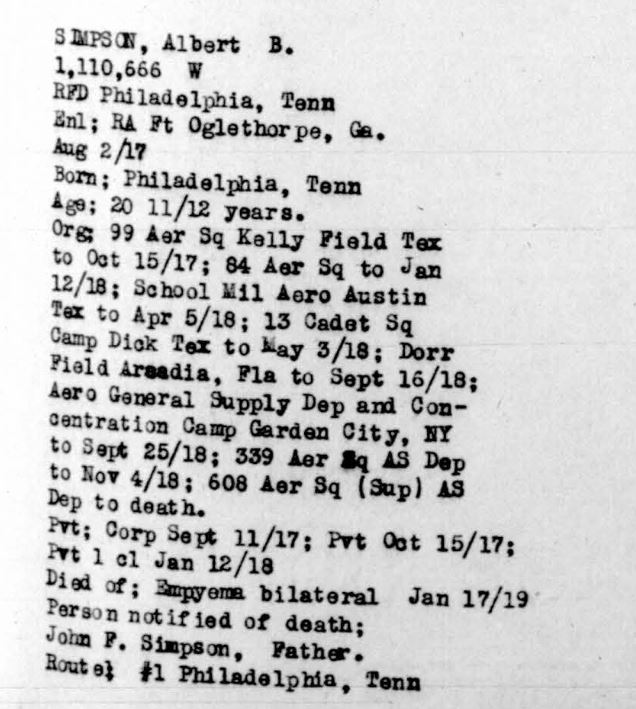 Cadet Albert Bowman Simpson, son of Mr. and Mrs. J.T. Simpson, of Fork Creek, died last Friday in a military hospital at Garden City, N.Y. He was stricken with influenza early in December, which later developed into double pneumonia. The body was brought to Sweetwater Monday afternoon, and funeral services were held Tuesday morning from the Rockville Church. Interment was in the graveyard nearby. The pallbearers were J. Earl May, D.M. Cleveland, Francis Yearwood, Marshal Henley, J. Gid Johnson and Corporal Samuel Wilkerson.