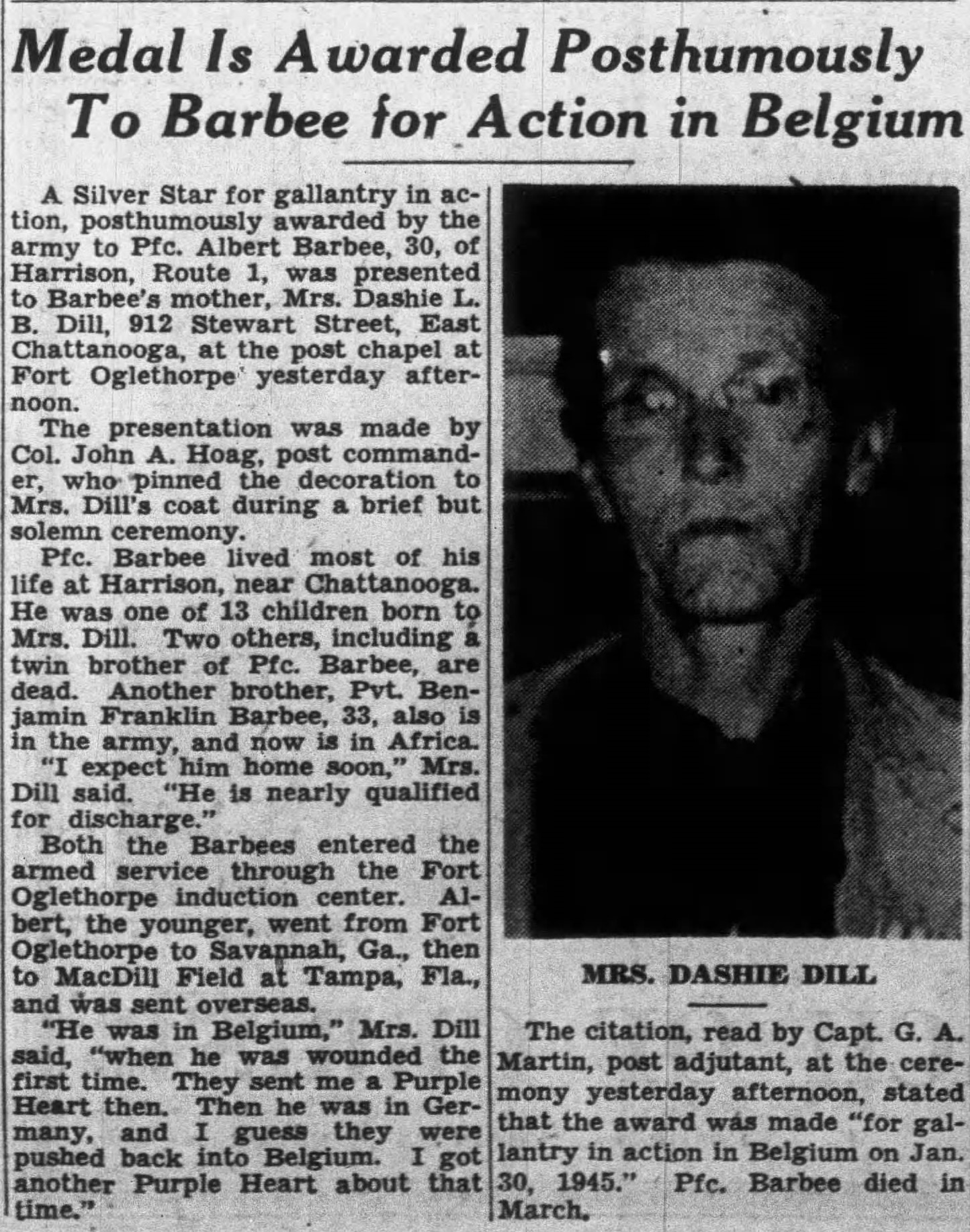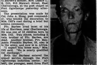 A Silver Star for gallantry in action, posthumously awarded by the army to Pfc. Albert Barbee, 30, of Harrison, Route 1, was presented to Barbee’s mother, Mrs. Dashie L.B. Dill, 912 Stewart Street, East Chattanooga, at the post chapel at Fort Oglethorpe yesterday afternoon.