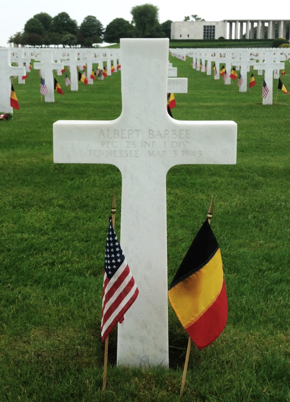 Private First Class Albert Barbee was assigned to Company E, 26th Infantry Regiment, 1st Infantry Division. At the time of his death the Division was involved in the Rhineland. He was killed in action on 3 March 1945, and was awarded the Silver Star on that date. He is interred at F,11,31 Henri-Chapelle American Cemetery, Henri-Chapelle, Belgium.