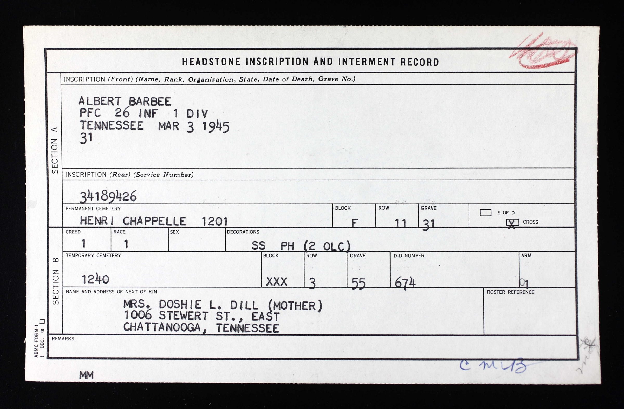 Pfc. Barbee lived most of his life at Harrison, near Chattanooga. He was one of 13 children born to Mrs. Dill. Two others, including a twin brother, Pfc. Barbee, are dead. Another brother, Pvt. Benjamin Franklin Barbee, 33, lso is in the army, and now is in Africa.”I expect him home soon,” Mrs. Dill said. “He is nearly qualified for discharge.” Both the Barbees entered the armed service through the Fort Oglethorpe induction center. Albert, the younger, went from Fort Oglethorpe to Savannah, Ga., then to MacDill Field at Tampa, Fla., and was sent overseas.