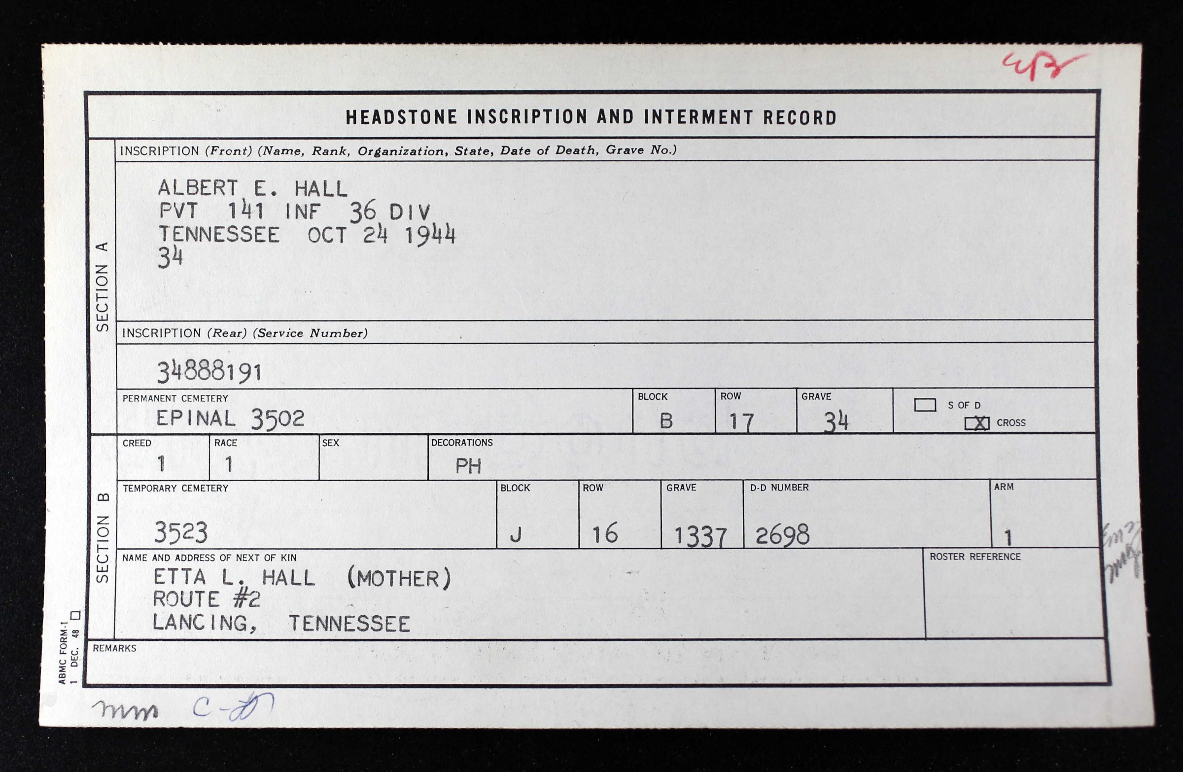 Private Albert E. Hall #34888191 US Army was assigned to the 141st Infantry Regiment, 36th Infantry Division.