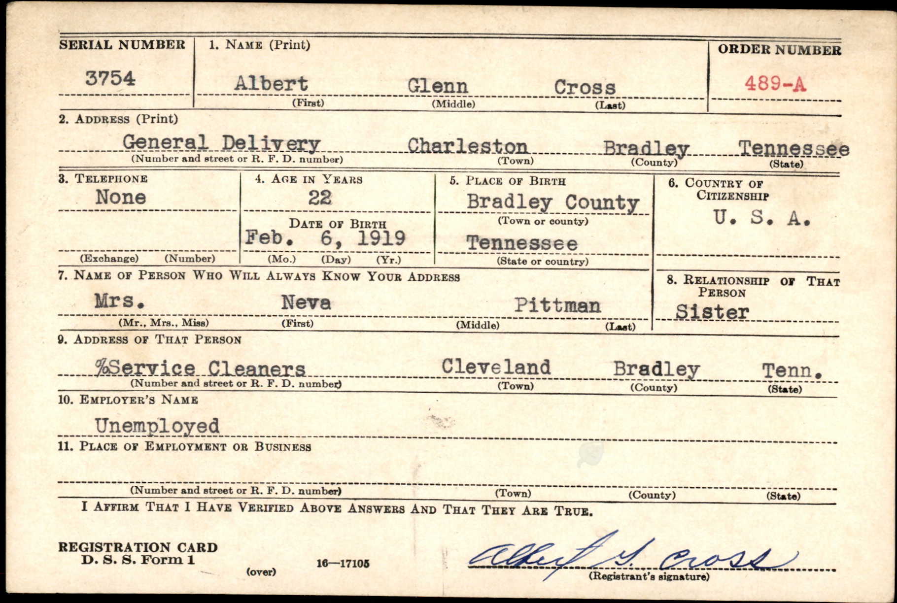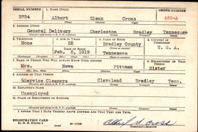 Albert Glenn Cross was born on 6 February 1919, the son of Albert Glenn Cross and Tessie Ora Cole. Husband of Fern May Pearl Andersson.