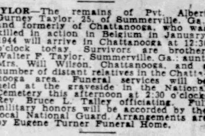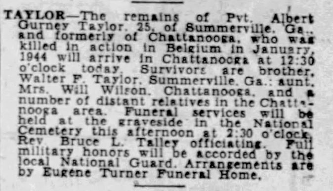 The remains of Pvt. Albert Gurney Taylor, 25 of Summerville, Ga., and formerly of Chattanooga, who was killed in action in Belgium in January 1944 will arrive in Chattanooga at 2:30 o’clock today. Survivors are brother, Walter F. Taylor, Summerville, Ga.; aunt, Mrs. Will Wilson, Chattanooga and a number of distant relatives in the Chattanooga area. Funeral services will be held at the graveside in the National Cemetery this afternoon at 2:30 o’clock. Full military honors will be accorded by the local National Guard.