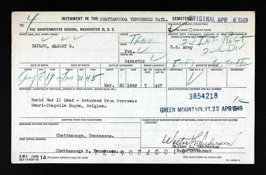 Pvt Taylor was initially buried at the American War Cemetery Henri-Chapelle in Belgium. He is buried at Chattanooga National Cemetery, Y, 457.