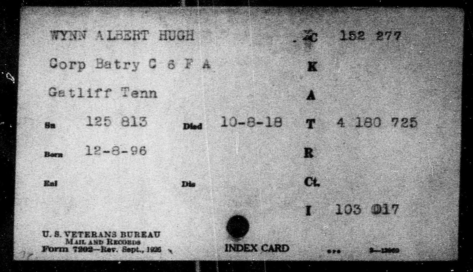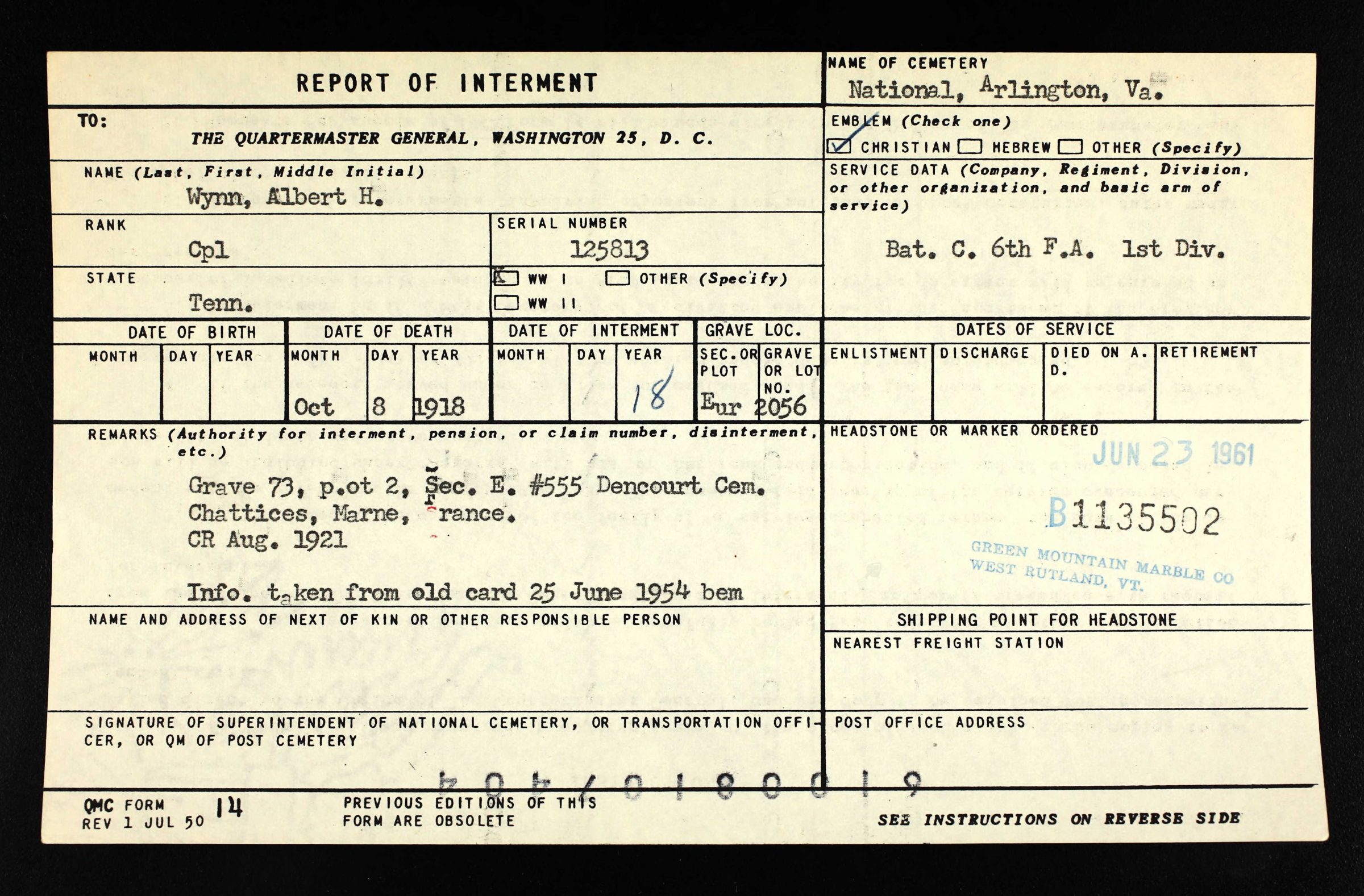 Cpl Wynn was initially buried at Dencourt Cemetery, Chattices, Marne, France. Buried at Arlington National Cemetery, Arlington, VA, Eur, 2056