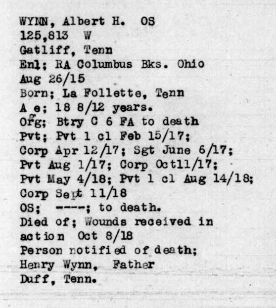 Albert Hugh Wynn died of wounds received in action 8 October 1918