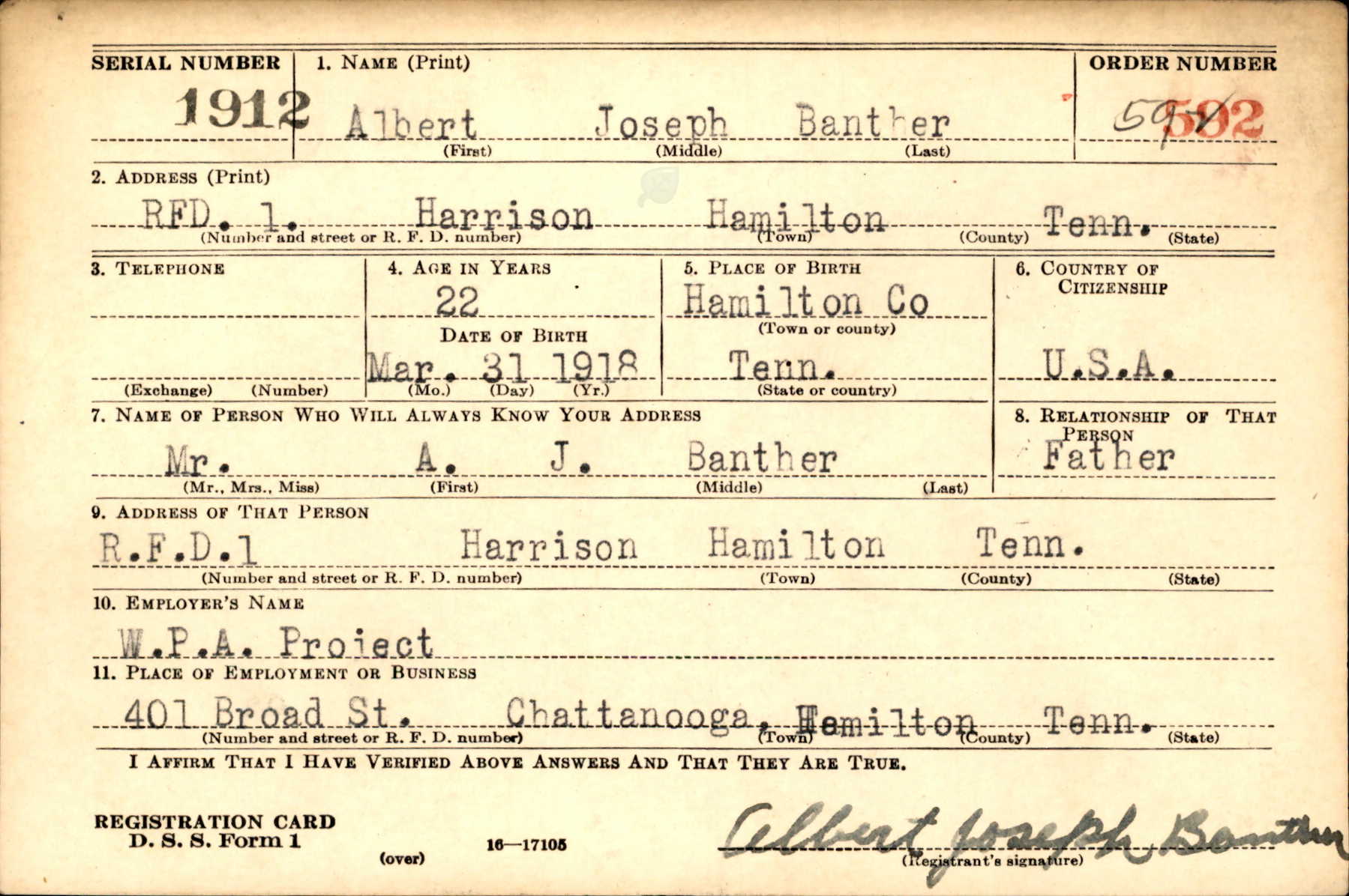 Albert Joseph Banther was born 31 March 1918 to Andrew Jackson Banther and Jessie Lee Knox.