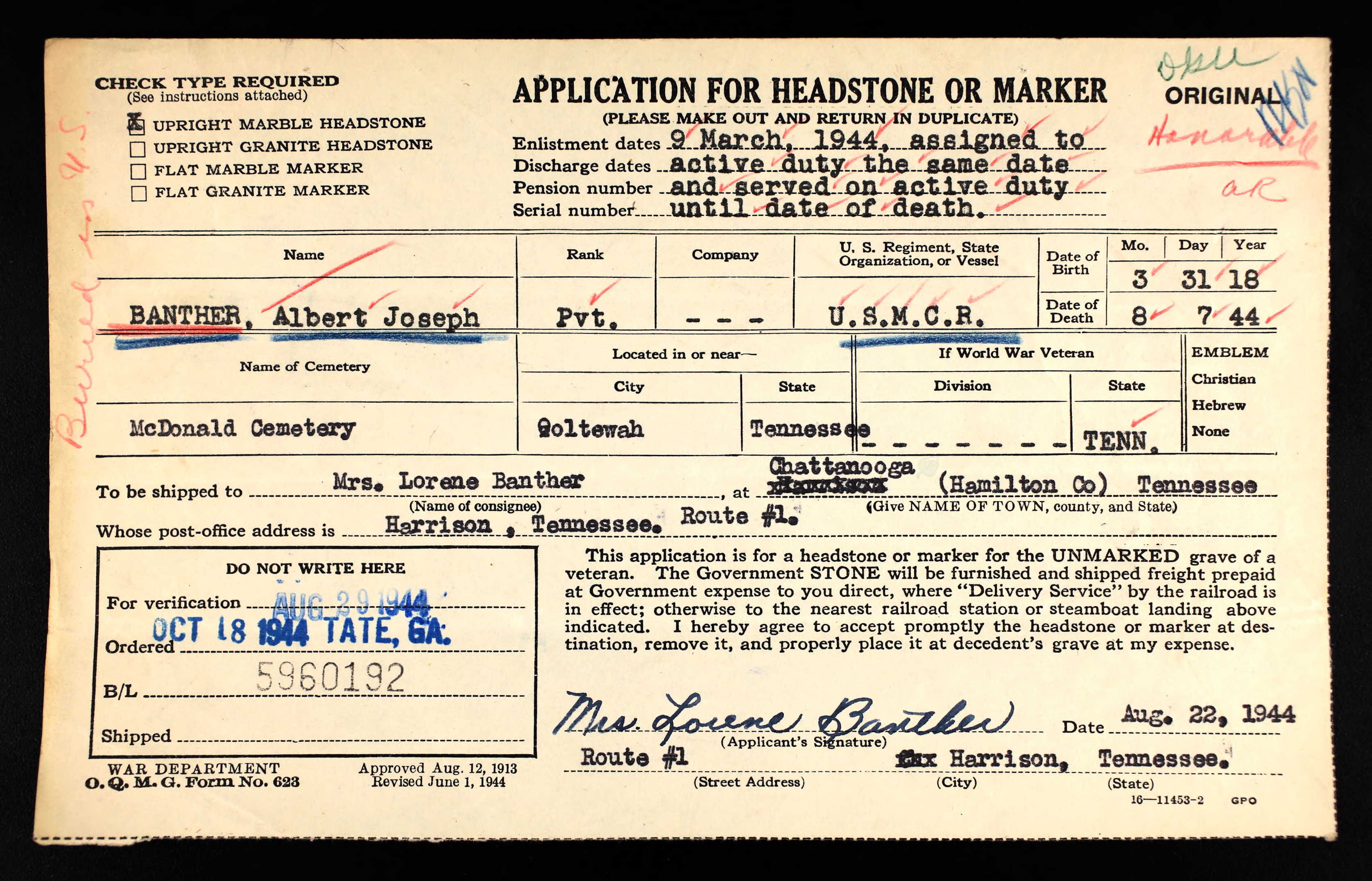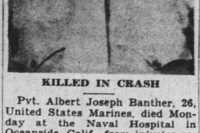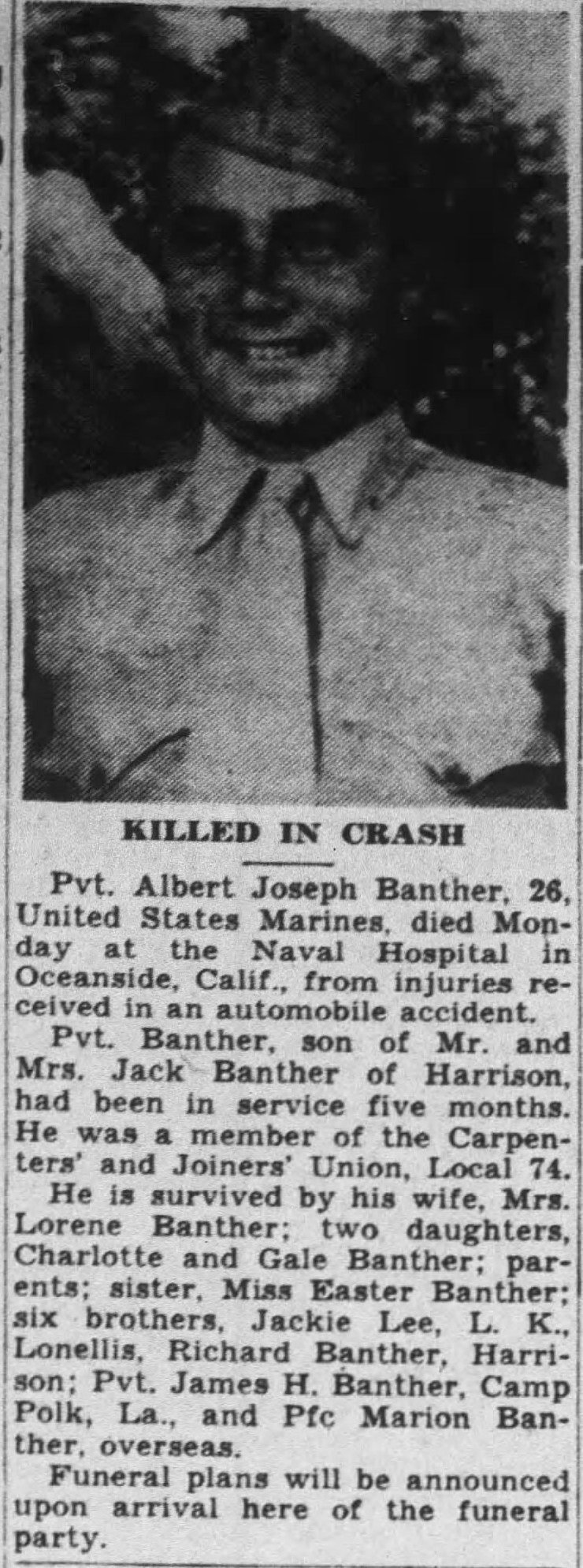 Pvt. Albert Joseph Banther, 26, United States Marines, died Monday at the Naval Hospital in Oceanside, Calif., from injuries received in an automobile accident. Pvt. Banther, son of Mr. and Mrs. Jack Banther of Harrison, had been in service five months. He was a member of the Carpenters’ and Joiners’ Union, Local 74. He is survived by his wife, Mrs. Lorene Bather; two daughters, Charlotte and Gale Banther; parents; sister, Miss Easter Banther; six brothers, Jackie Lee, L.K., Lonellis, Richard Banther, Harrison; Pvot. James H. Banther, Camp Polk, La., and Pfc Marion Banther, overseas.