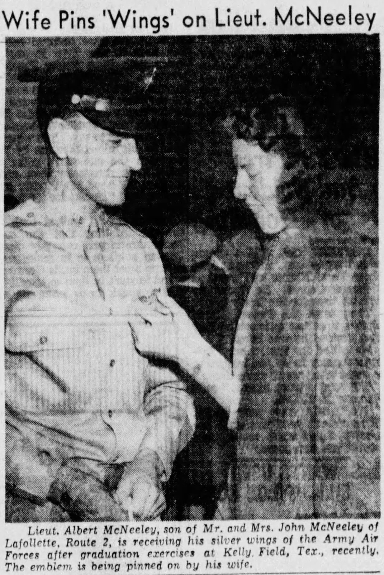 Lieutenant Albert McNeely received his silver wings of the Army Air Force after graduation at Kelly Field in Texas in October 1942. He attended the University of Tennessee and was an airplane mechanic in the Army Air Force before taking his primary flight training at Bonham, Texas. He was the son of John McNeeley of LaFollette.