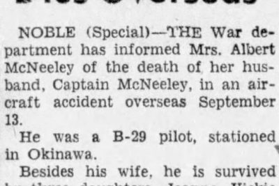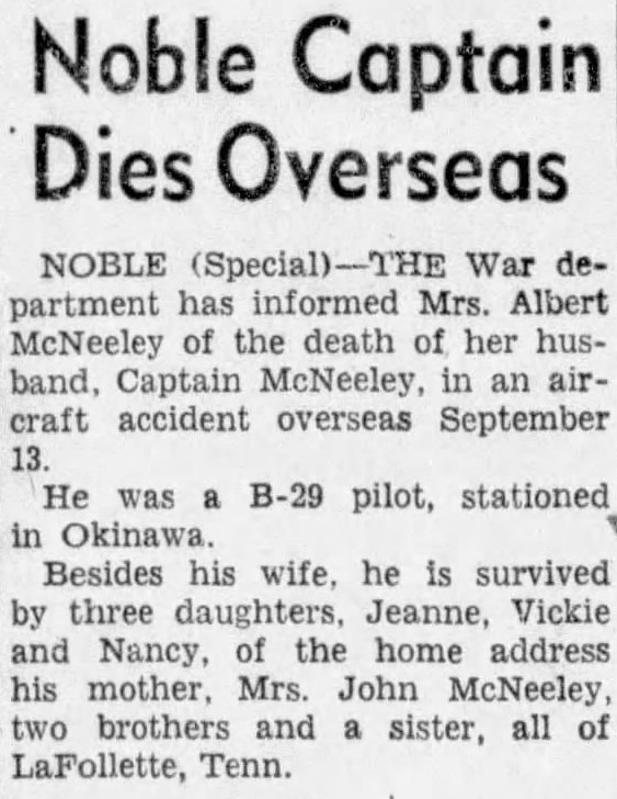 The War department has informed Mrs. Albert McNeeley of the death of her husband, Captain McNeeley, in an aircraft accident overseas September 13. He was a B-29 pilot, stationed at Okinawa. Besides his wife, he is survived by three daughters, Jeanne, Vickie and Nancy, of the home address his mother, Mrs. John McNeeley, two brothers and a sister, all of LaFollette, Tenn.