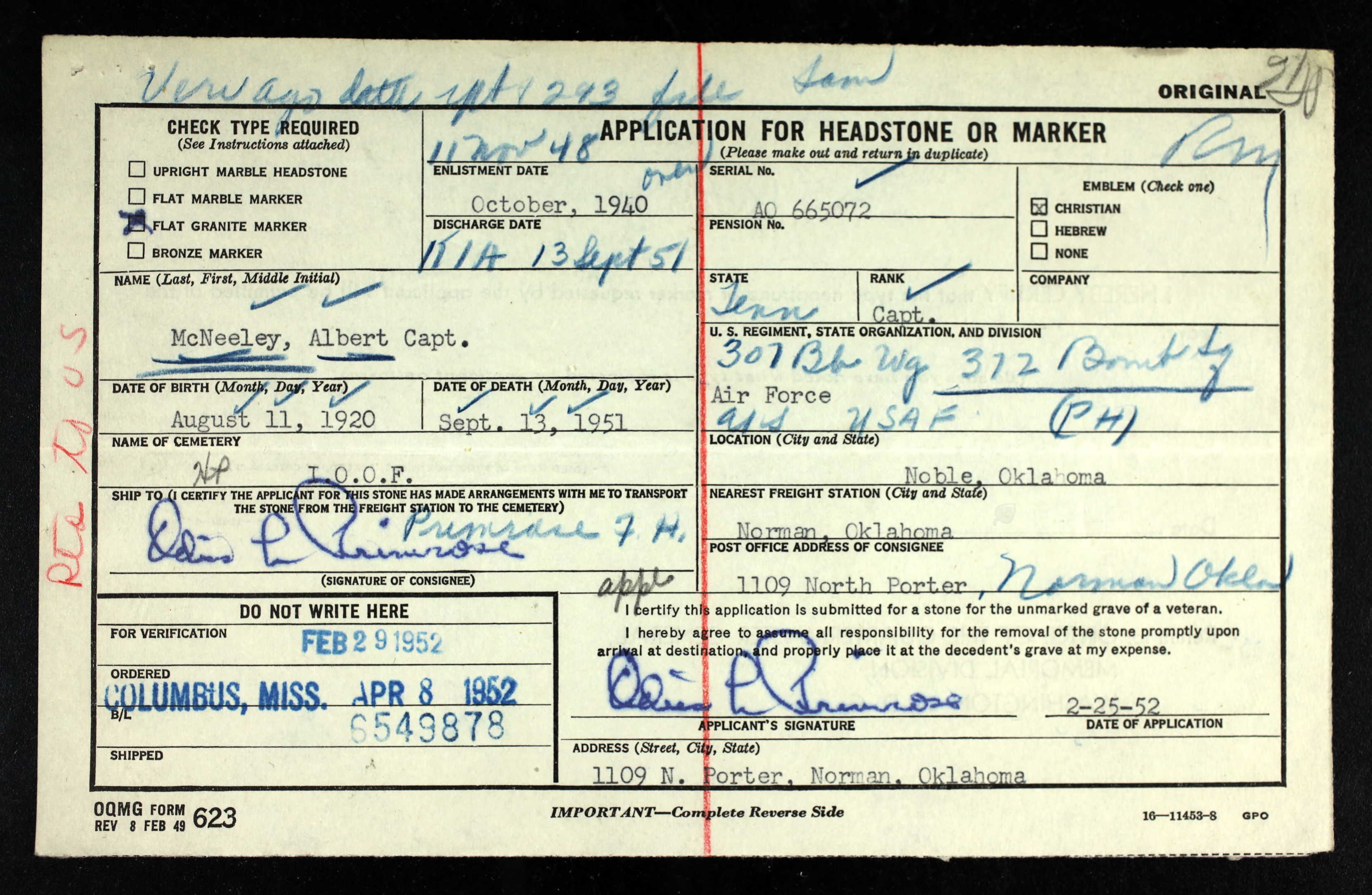 - Burial/Memorial Location: Noble IOOF Cemetery, Noble, Cleveland County, Oklahoma