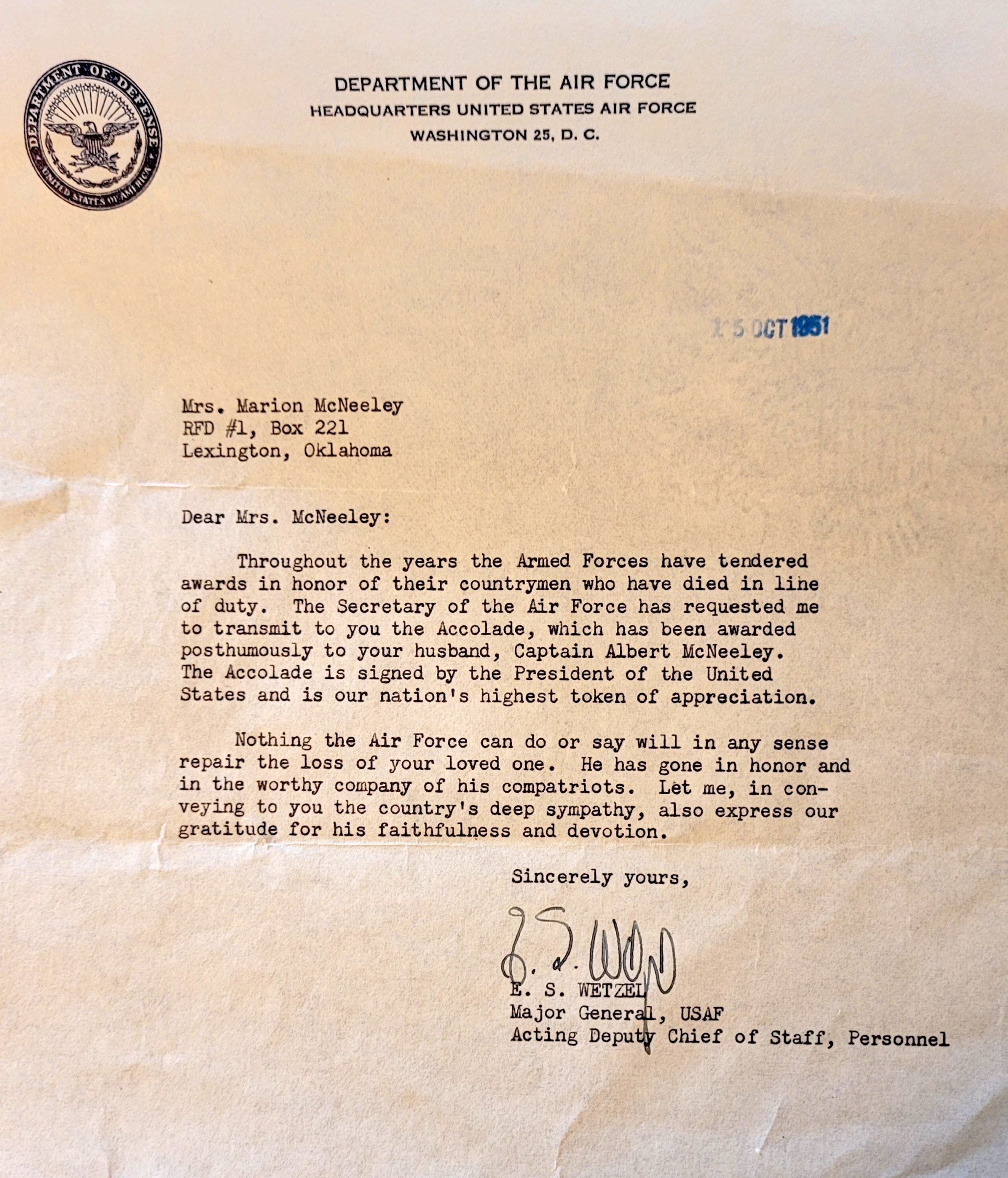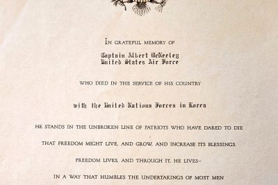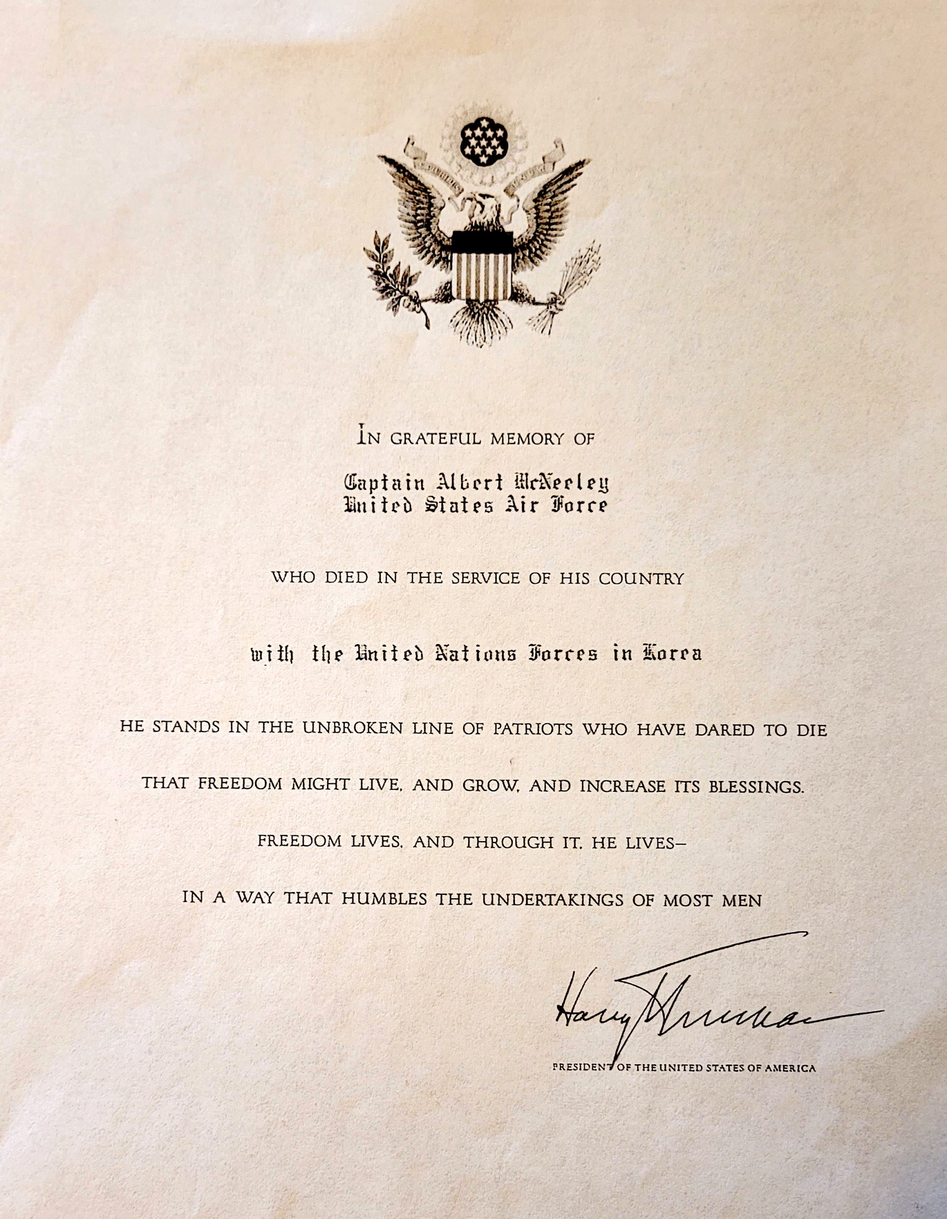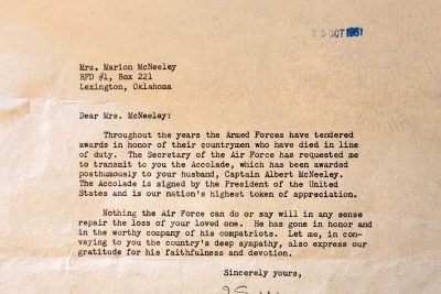 Captain McNeeley was a crewmember of a B-29A Superfortress Bomber with the 372nd Bomber Air Squadron, 307th Bomber Wing based at Kadena Air Base, Okinawa. On September 13, 1951, the aircraft was on a combat mission when it crashed into a mountain near Taem-don, South Korea killing all 14 servicemen on board.