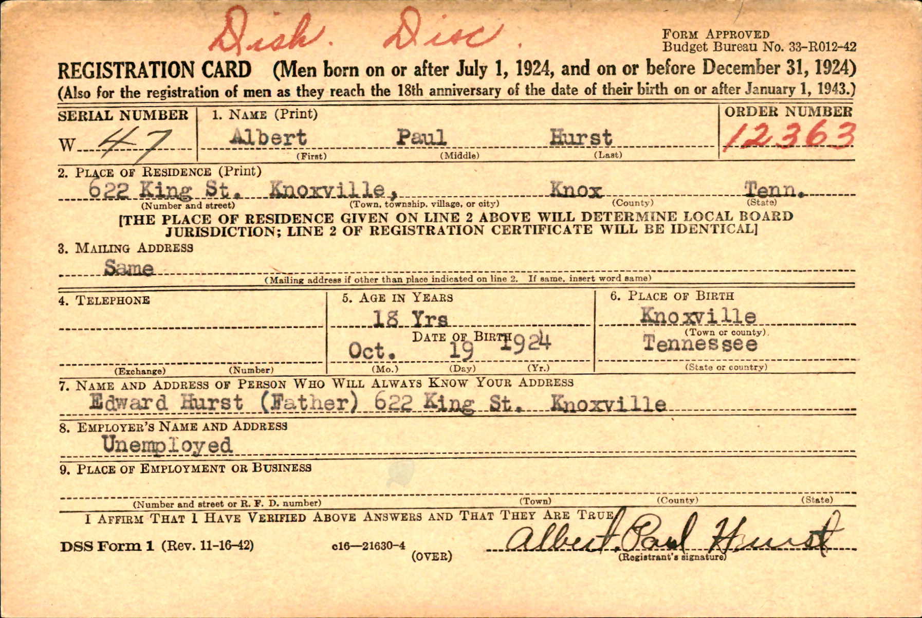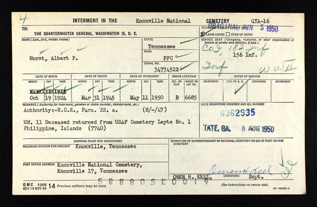 Albert Paul Hurst was born in Knoxville, Tennessee, the son of Moses Edward Hurst and Adeline Monzella “Addie” Hipshire. he attended Knoxville High School and enlisted on May 25, 1943, in Fort Oglethorpe, GA. PFC Hurst was returned from USAF Cemetery Leyte No. 1, Philippine Islands. Buried May 11, 1950, Knoxville National Cemetery (Section B Site 6685)