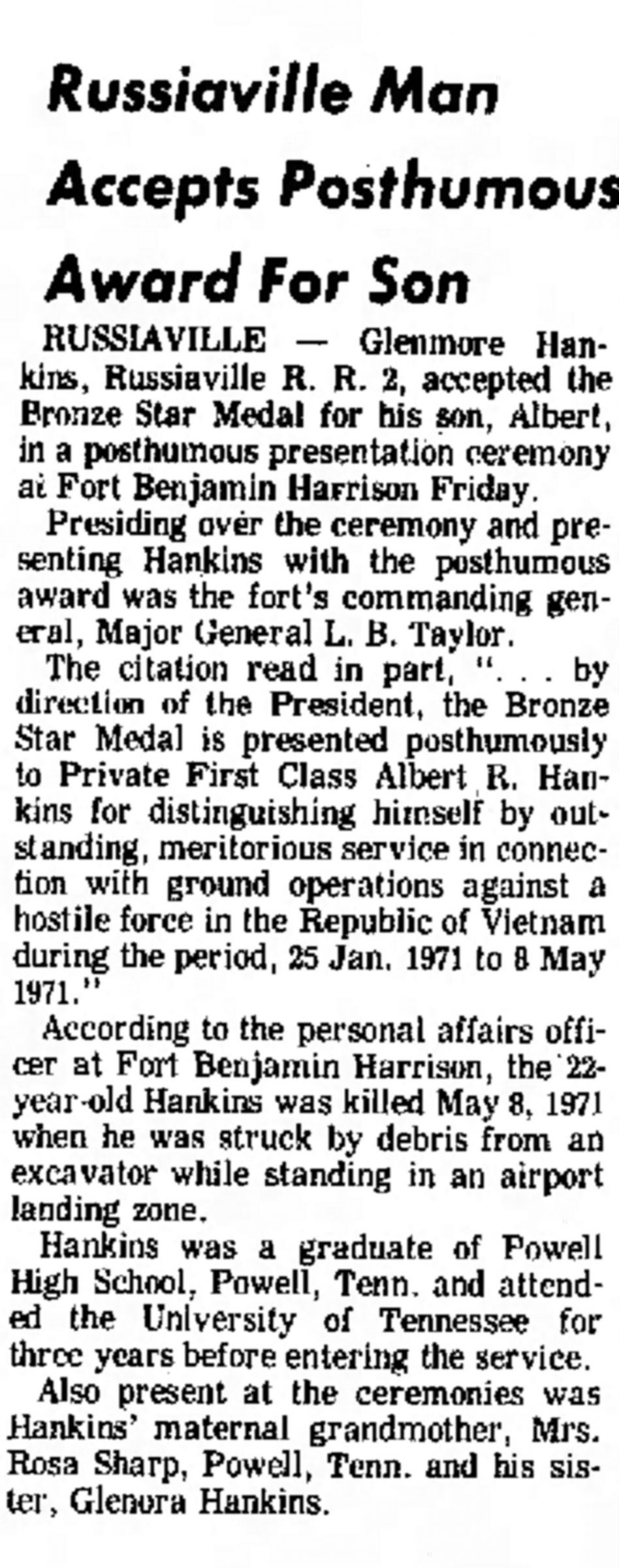 According to the perosnal affairs officier at Fort Benjamin Harrison, the 22-year old Hankins was killed May 8, 1971 when he was struck by debris from an excavator while standing in an airport landing zone. Hankins was a graduate of Powell High School, Powell, Tenn. and attended the University of Tennessee for three years before entering the service.