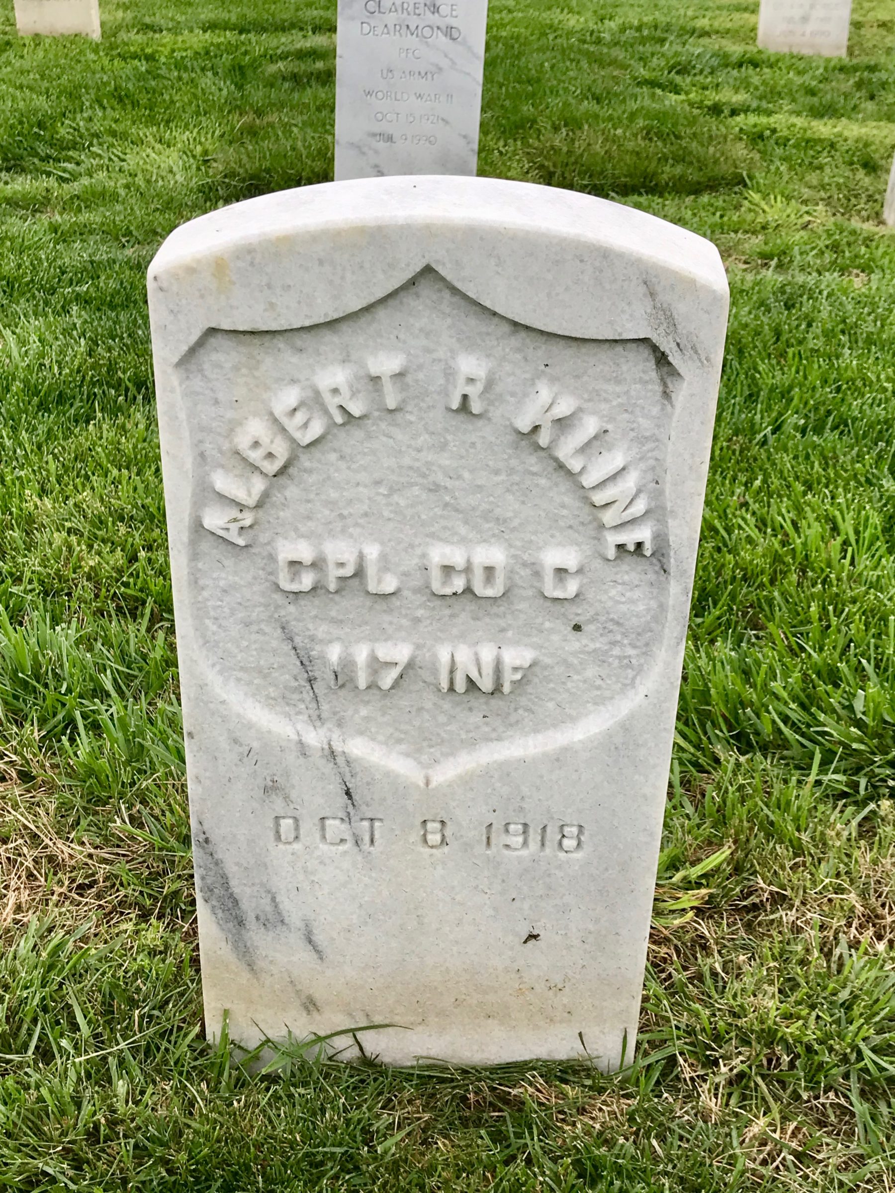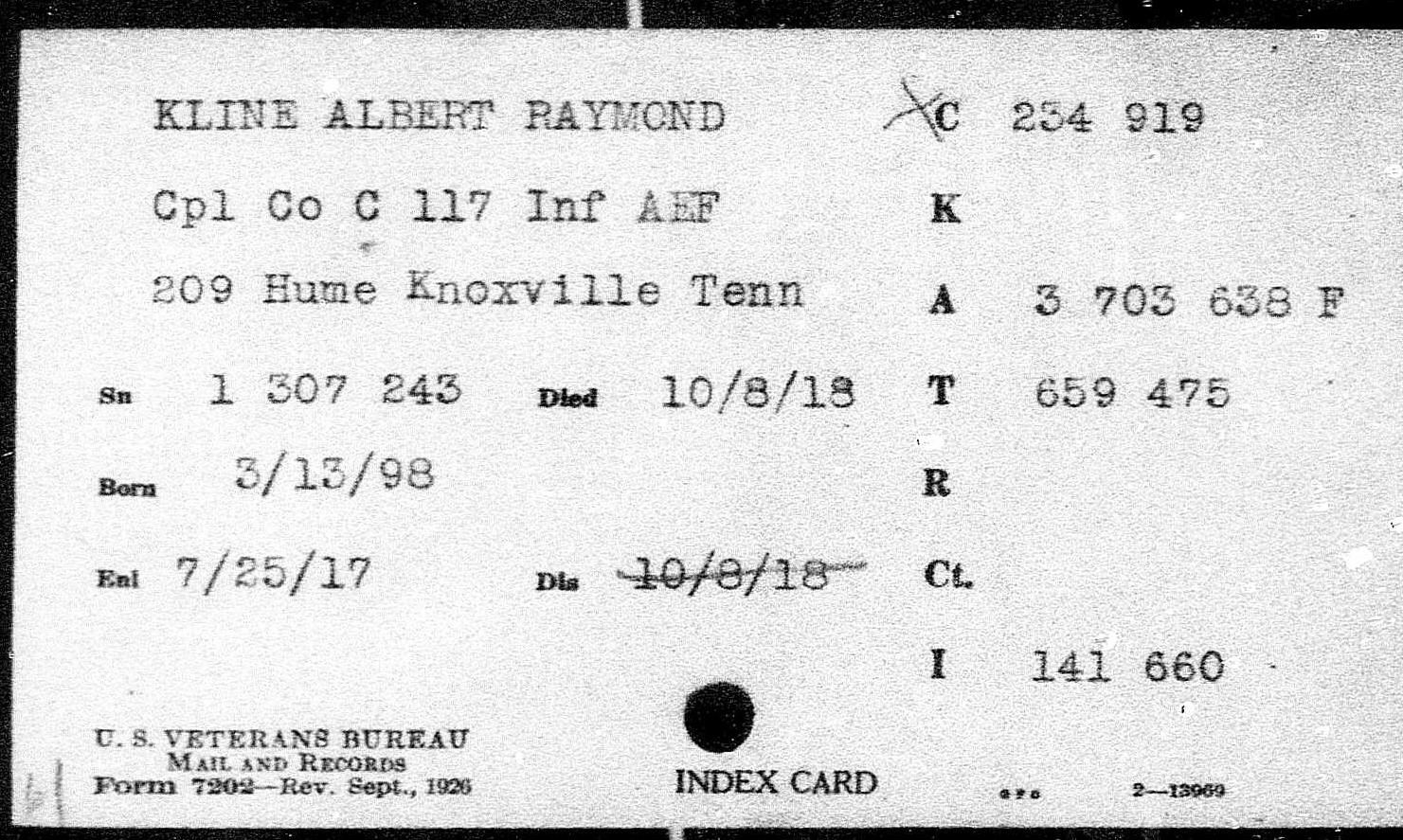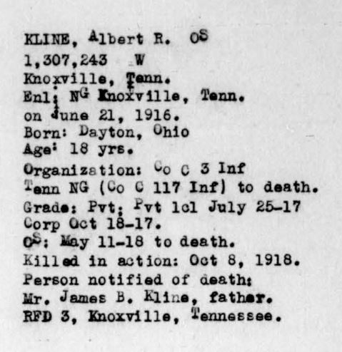 Albert Raymond Kline saw service on the Mexican border with the Third Tennessee Infantry in 1916. Was a member of Company C, 117th Infantry, 30th Division. Sailed for overseas duty May 11, 1918, and was in all battles of his organization until October 8, 1918, on which day he was wounded. Date and cause of death undetermined. He was born in Dayton, Ohio.