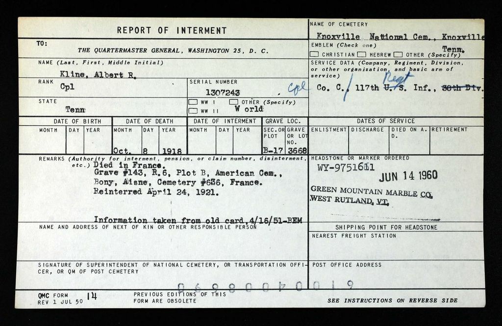 He is buried at the Knoxville National Cemetery. His grave maker states date of death as the same day he was wounded, October 8, 1918. Was initially buried at the American Cemetery, Bony, Aisne in France.
