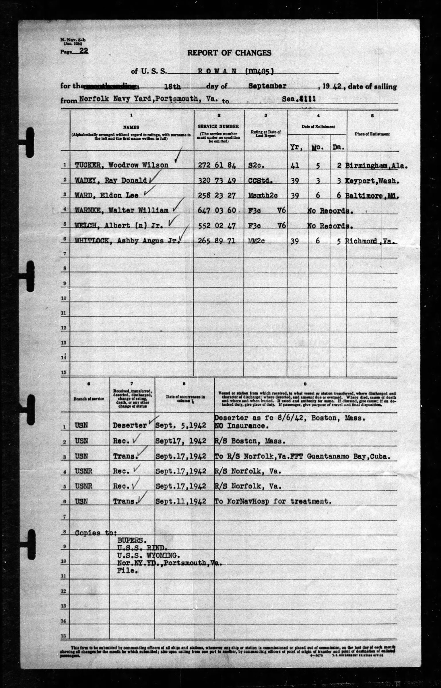 Albert Welch was transferred from Norfolk Navy Yard, Portsmouth, Virginia to the U.S.S. Rowan (DD405) on 17 September 1942. He was killed on the USS Rowan on 11 September 1943 and was officially declared dead on 12 September 1944.