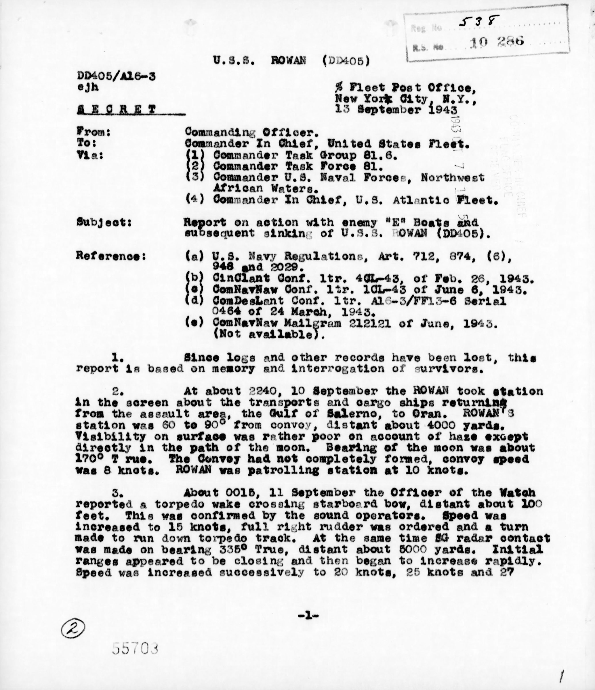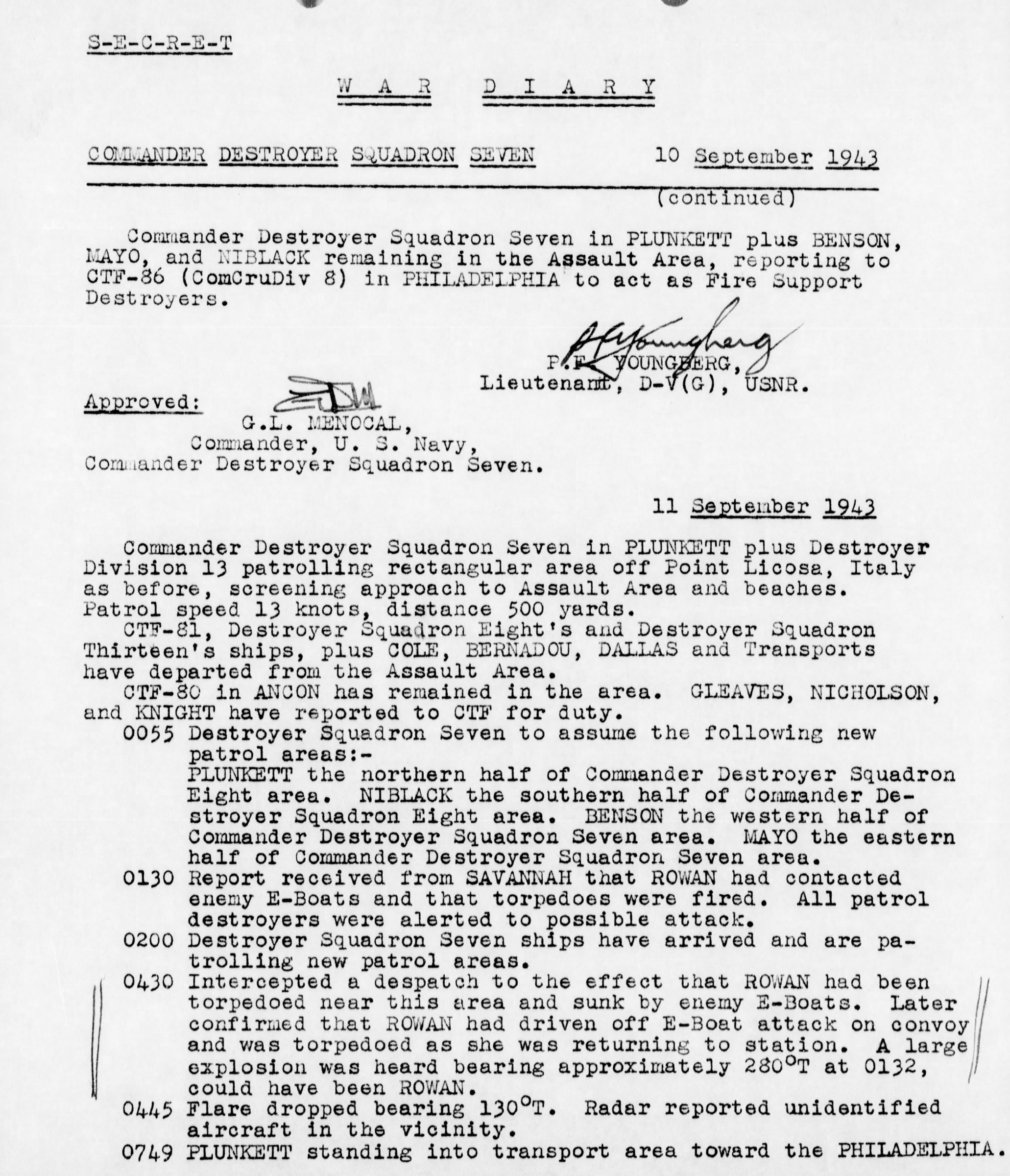 At about 2240, 10 September the Rowan took station in the screen about the transports and cargo ships returning from the assault area, the Gulf of Salerno, to Oran. Rowan´s station was 60 to 90 from convoy, distant about 4000 yards. Visibility of surface was rather poor on account of haze except directly in the path of the moon. The convoy had not completely formed, convoy speed was 8 knots. Rowan was patrolling station at 10 knots.