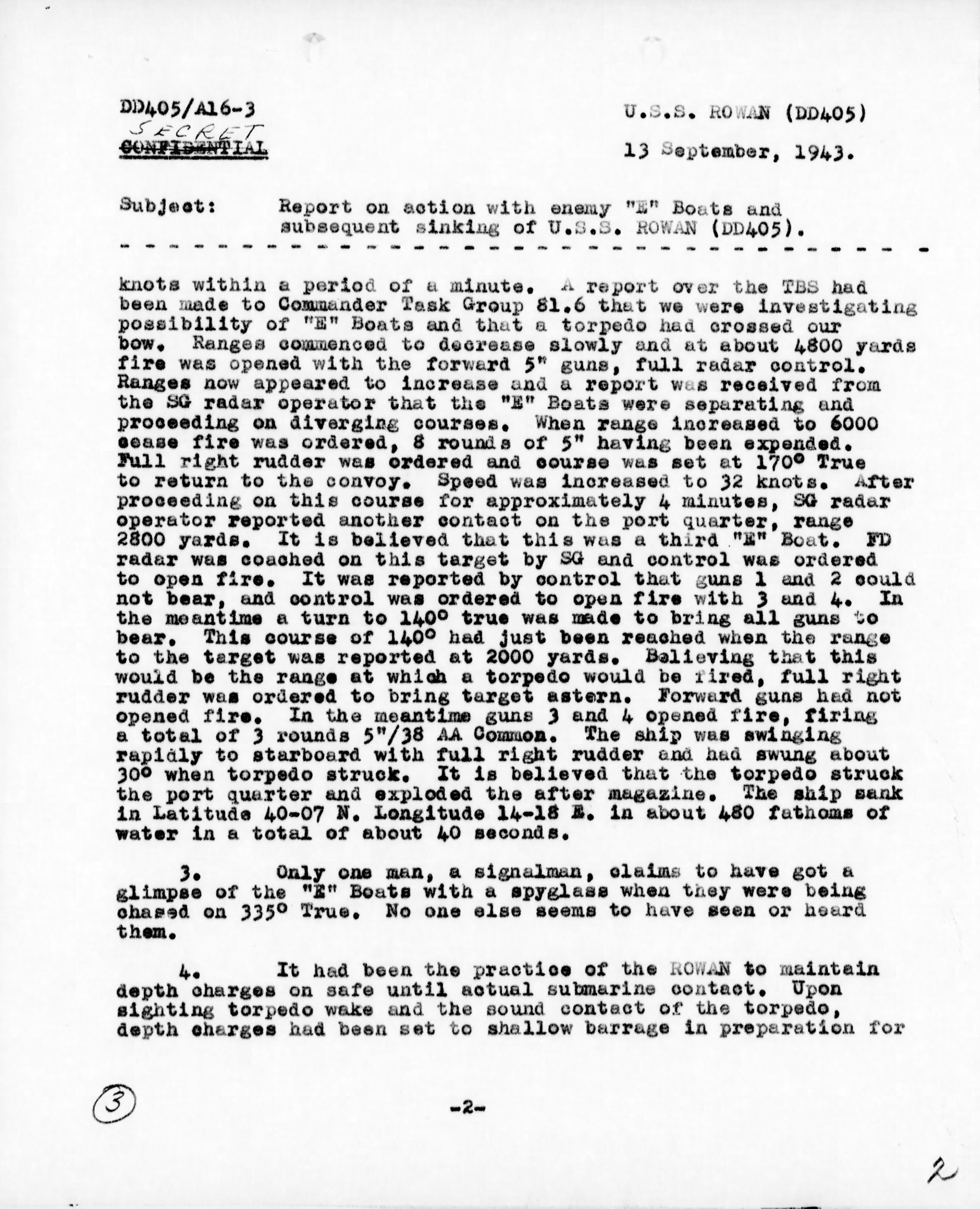 The Rowan was struck by the torpedo and sank in latitude 40-07N. Longitude 14-18E. in about 480 fathoms of water in total of about 40 seconds.