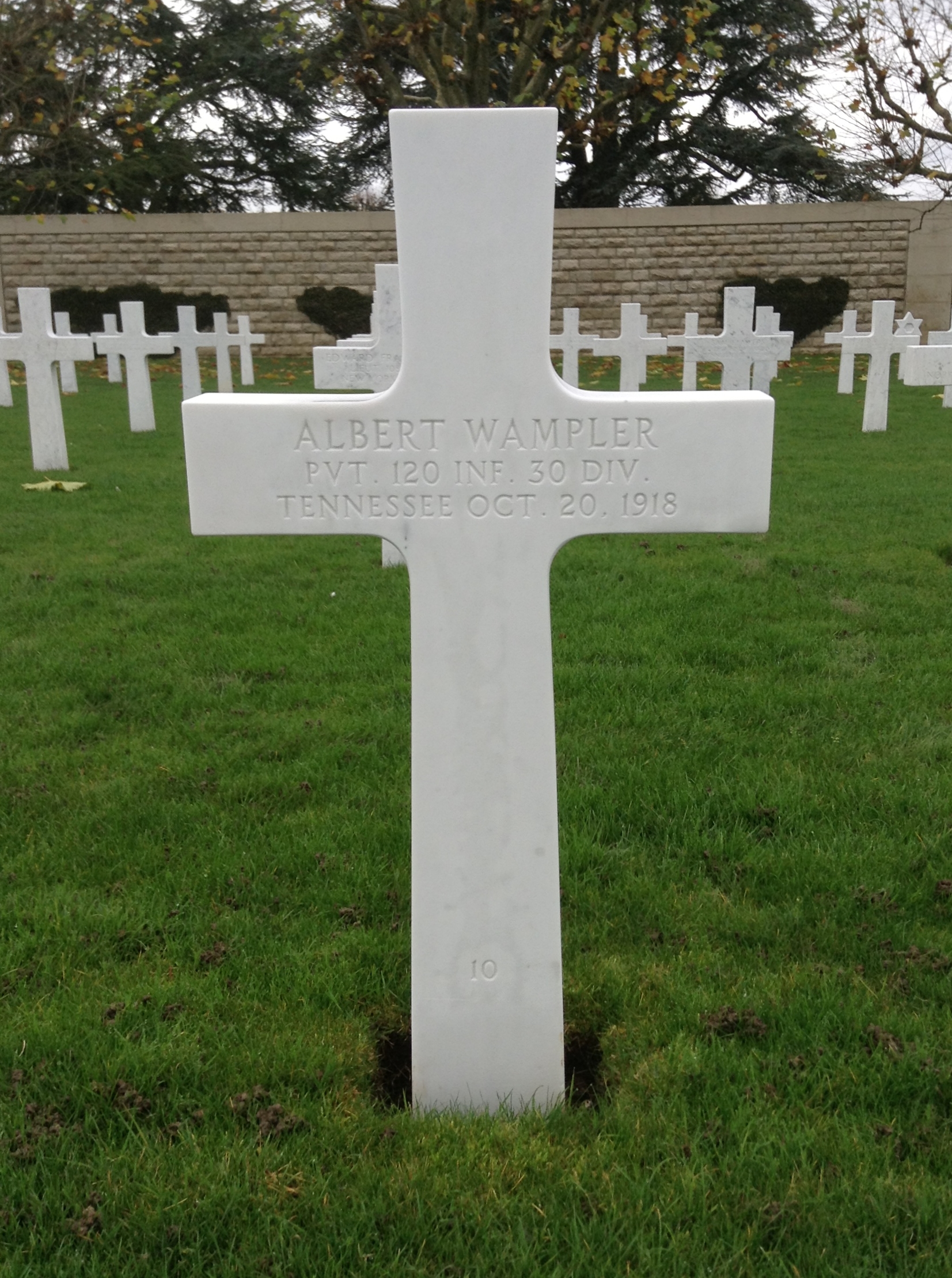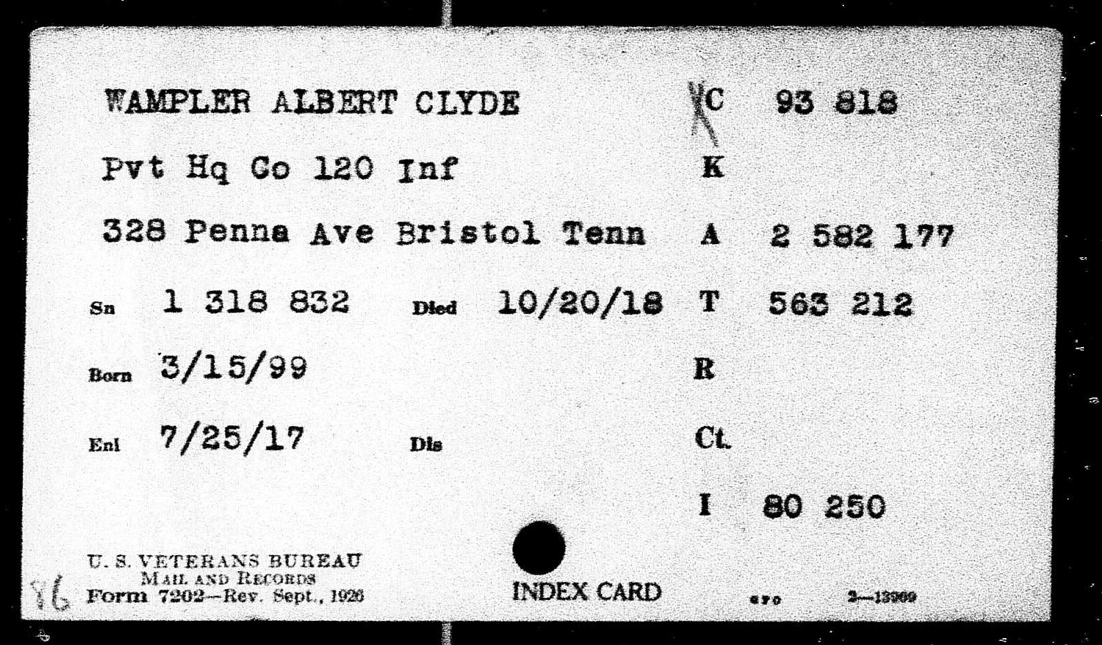 Private Albert Clyde Wampler was born in Wallace, Virginia to William Delany Wampler and Margaret Anne Weaver. He enlisted in the Army at the age of 18. He was assigned to the 120th Infantry Regiment, 30th Division AEF. He died of wounds received in action on 20 October 1918 and is interred at D,19,10, Somme American Cemetery, Bony, France.