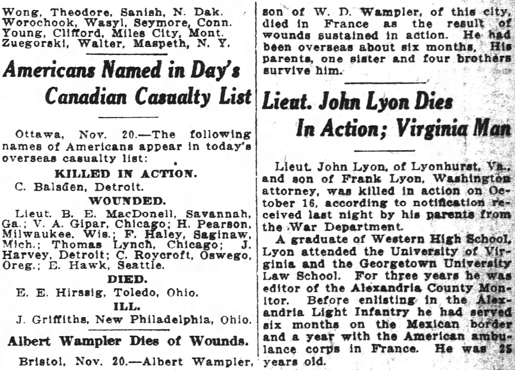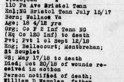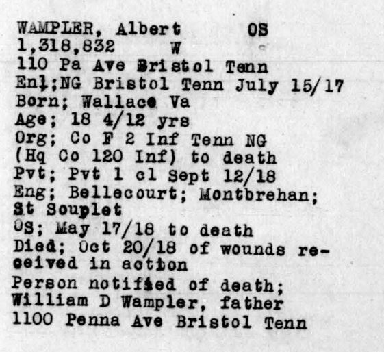 Bristol Nov. 20 – Albert Wampler, son of W.D. Wampler of this city died in France as the result of wounds sustained in action. He had been overseas about six months. His parents, one sister and four brothers survive him.