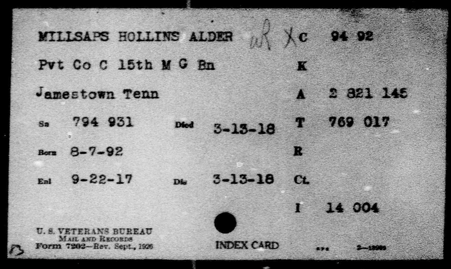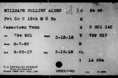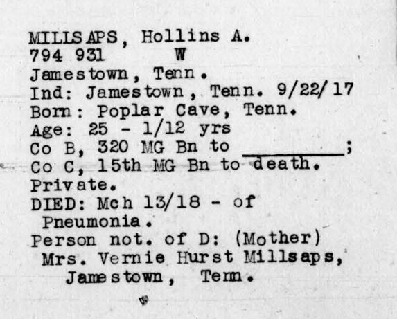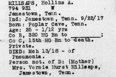 Alder Hollis Millsaps was born 7 August 1892 in Helena, Tennessee. He died of pneumonia on March 13, 1918 in Georgia.
