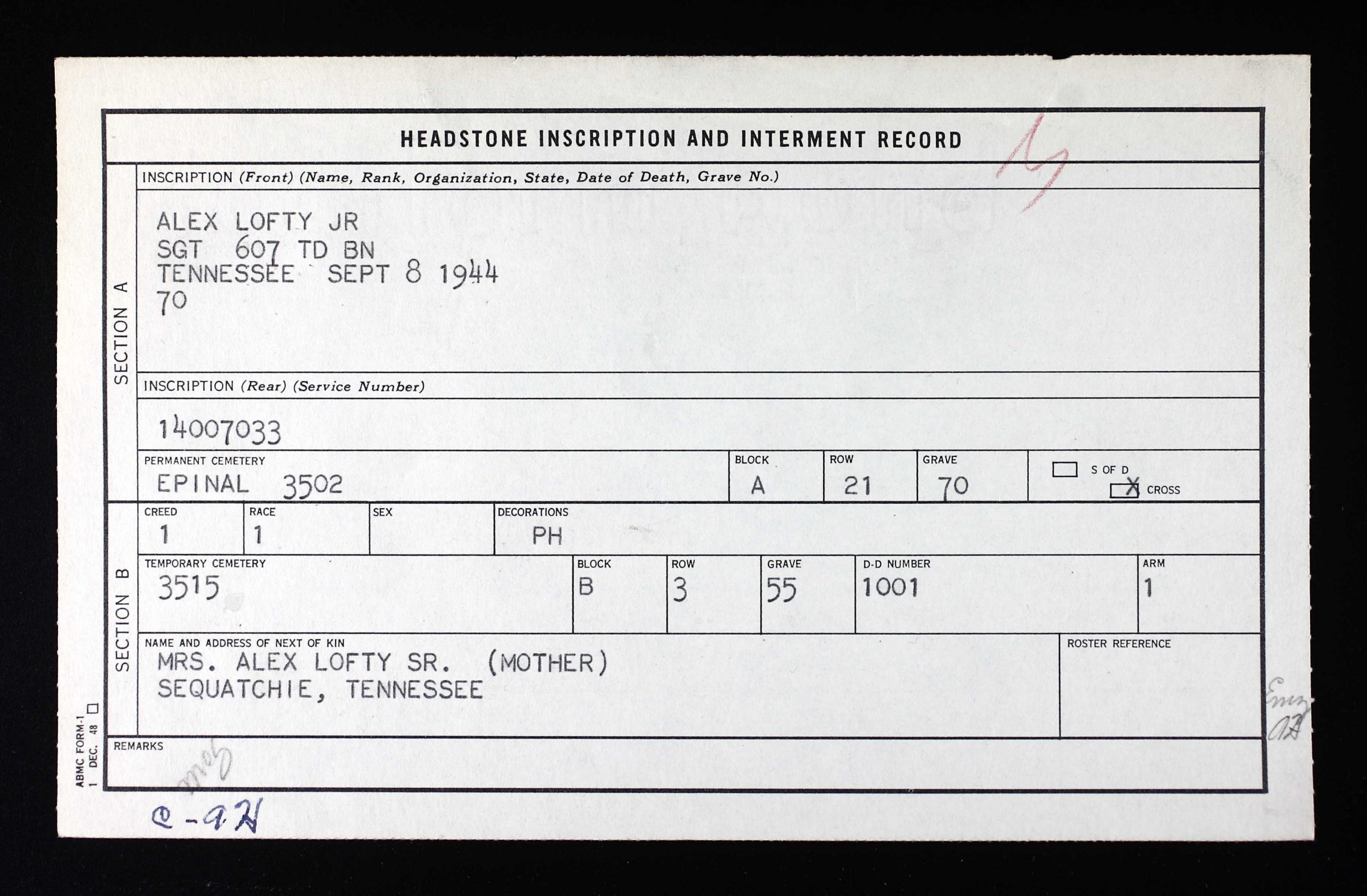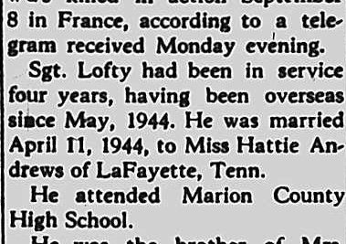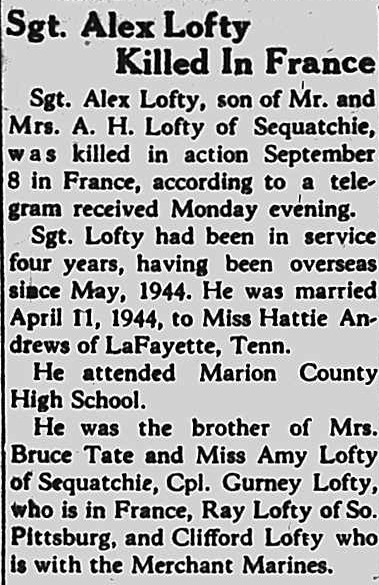 Sgt. Alex Lofty, son of Mr. and Mrs. A.H. Lofty of Sequatchie, was killed in action September 8 in France, according to a telegram received Monday evening. Sgt. Lofty had been in service four years, having been overseas since May, 1944. He was married April 11, 1944 to Miss Hattie Andrews of LaFayette, Tenn. He attended Marion County High School. He was the brother of Mrs. Bruce Tate and Miss Amy Lofty of Sequatchie, Cpl. Gurney Lofty, who is in France, Ray Lofty of So. Pittsburg, and Clifford Lofty who is with the Merchant marines.