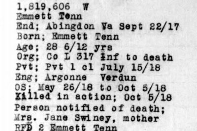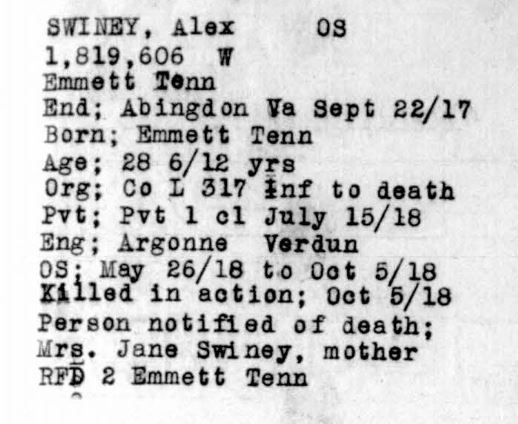 Alex or Alexander Swiney was born in Emmett, Tennessee, son of Jane Swiney. He was killed in action on 5 October 1918 in France.