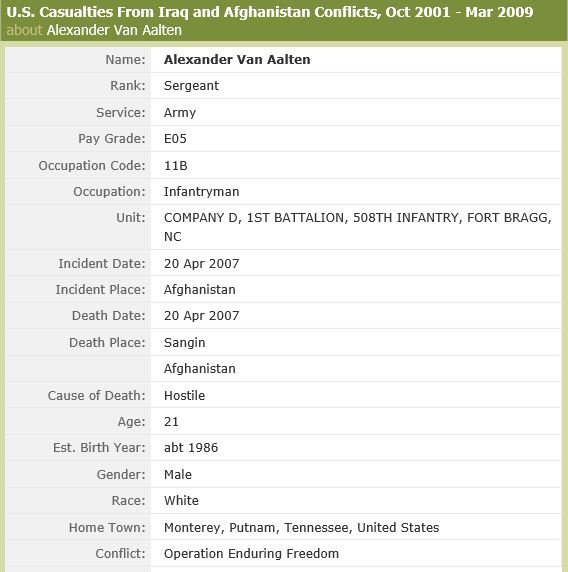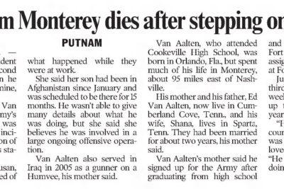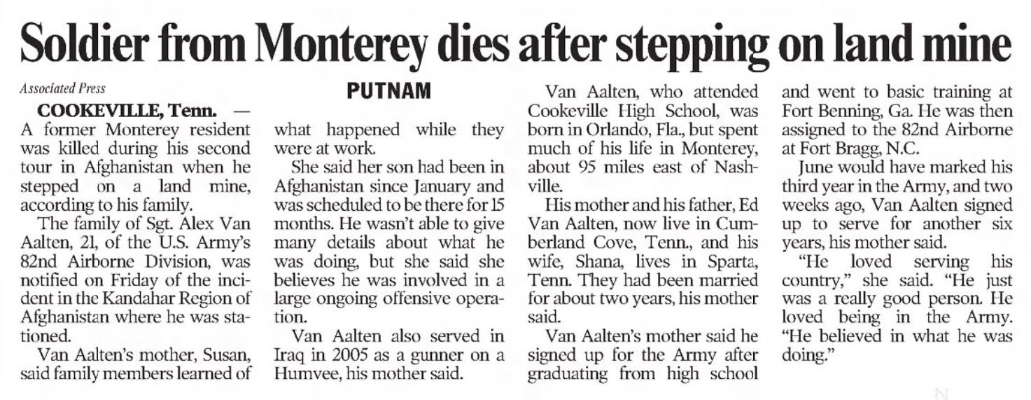 Sgt. Alex Van Aalten of Tenn., was a Cookeville High School graduate where he was brigade commander for the ROTC. He signed up for the Army soon after and went to basic training at Ft. Benning in Georgia. Van Aalten served his country in Iraq in 2005 where he was a gunner on a humvee whose main objective was to run insurgents out of town so the citizens could vote. He had been in Afghanistan since January and was scheduled to be there for 15 months. June 2007 would have marked his third year in the Army, and he signed up to serve for another six years. His family moved to Monterey at an early age and he spent much of his life there. Van Aalten was a strong Christian and a leader. Before he was deployed, he taught karate to children and attended Trinity Assembly as well as Cookeville First Assembly. He also liked to go rock climbing and four-wheeling and was involved in the church youth group when he lived here. He loved serving his country. This is what he always wanted to do. He and his wife had been married for about two years. He was preceded in death by his maternal grandmother, Ella May Fowler Stokes and a paternal grandfather, Edward van Aalten Sr. He was 21. In July 2009, The bridge between Monterey exits 300 and 301 was designated the “Sgt. Alex van Aalten Memorial Bridge” in honor of the late Sgt Alex van Aalten after a Senate Joint Resolution, proposed by Sen. Charlotte Burks and Rep. Charles Curtiss was passed.
